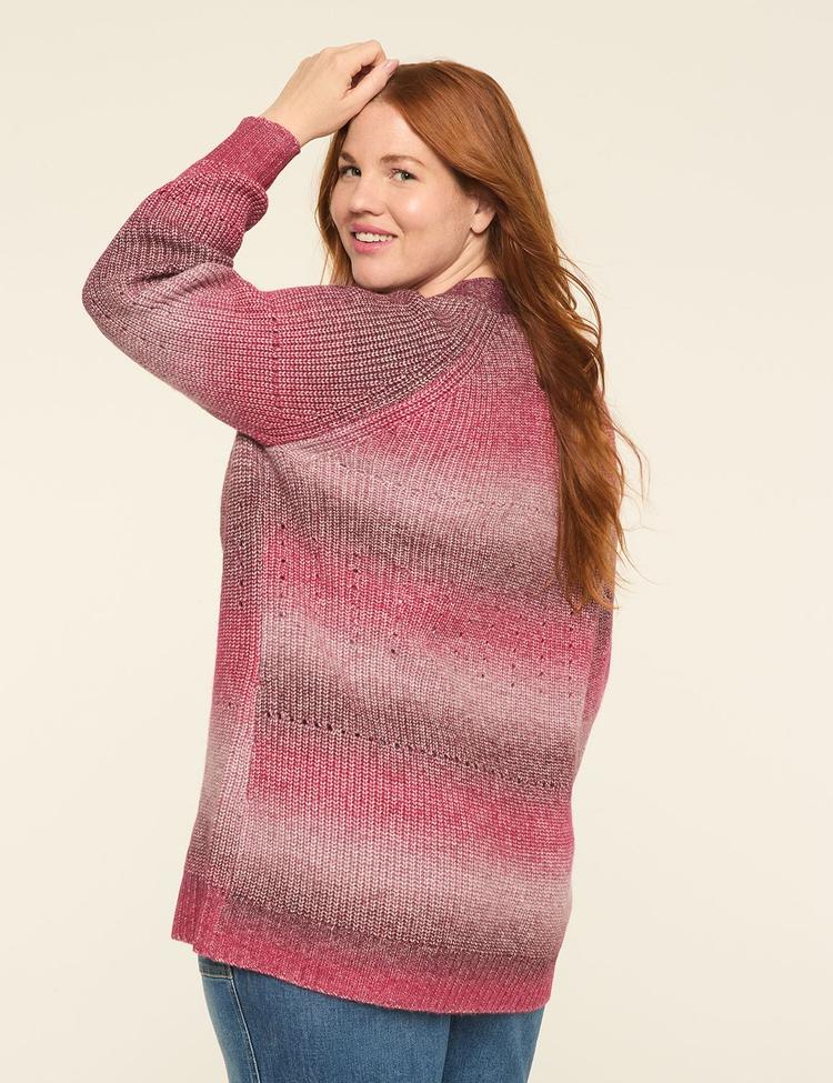 This plus size ombre open-front cardigan showcases a cozy knit in dusty rose and muted mauve hues with a soft gradient effect. Featuring long regular sleeves and a hip-length classic fit, it offers comfortable layering with an open front and ribbed trim detailing along the border, cuffs, and hem. Crafted from a soft acrylic-polyester blend, this textured sweater knit is perfect for casual, loungewear, or workwear occasions during autumn through spring seasons.