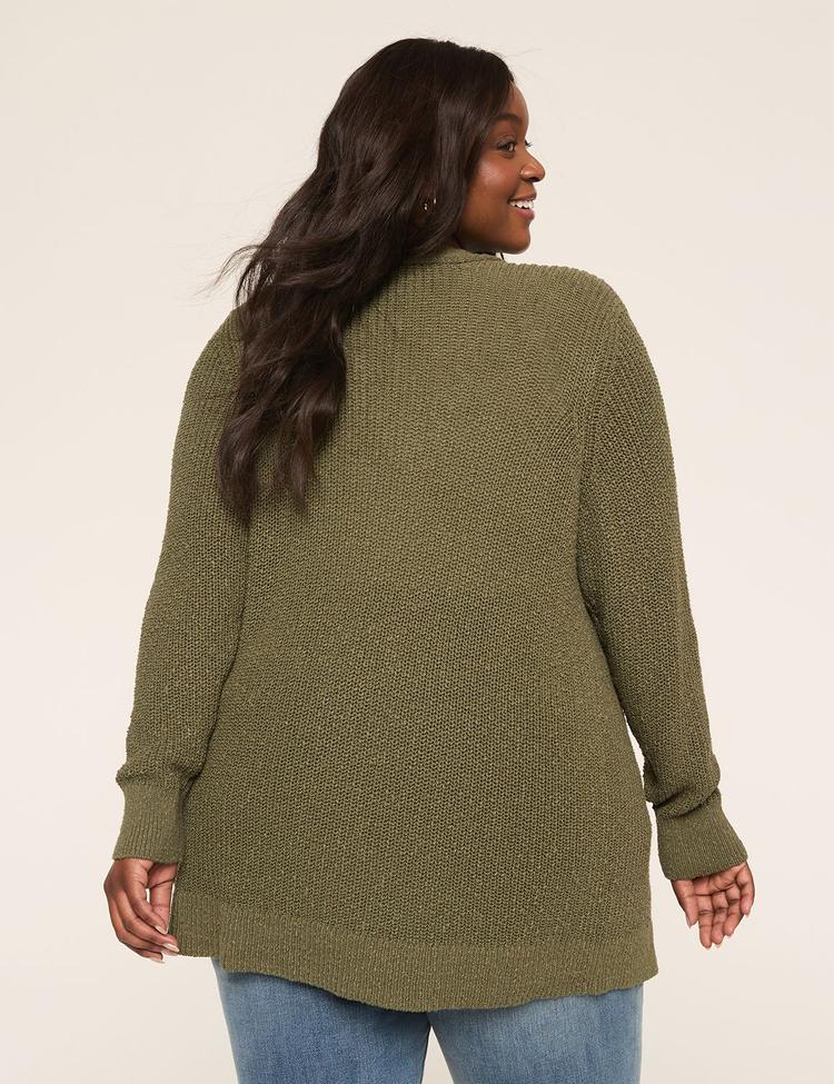 This classic plus size cardigan in a matte olive hue offers a comfortable, just-right fit designed for curves. Crafted from a soft, breathable cotton-polyester sweater knit, it features an open front and long sleeves with ribbed trim for subtle texture. The hip-length silhouette provides added coverage, making it perfect for layering over dresses, tees, or workout sets. Its versatile and casual chic style suits casual outings, loungewear, and workwear during autumn, winter, and spring seasons.