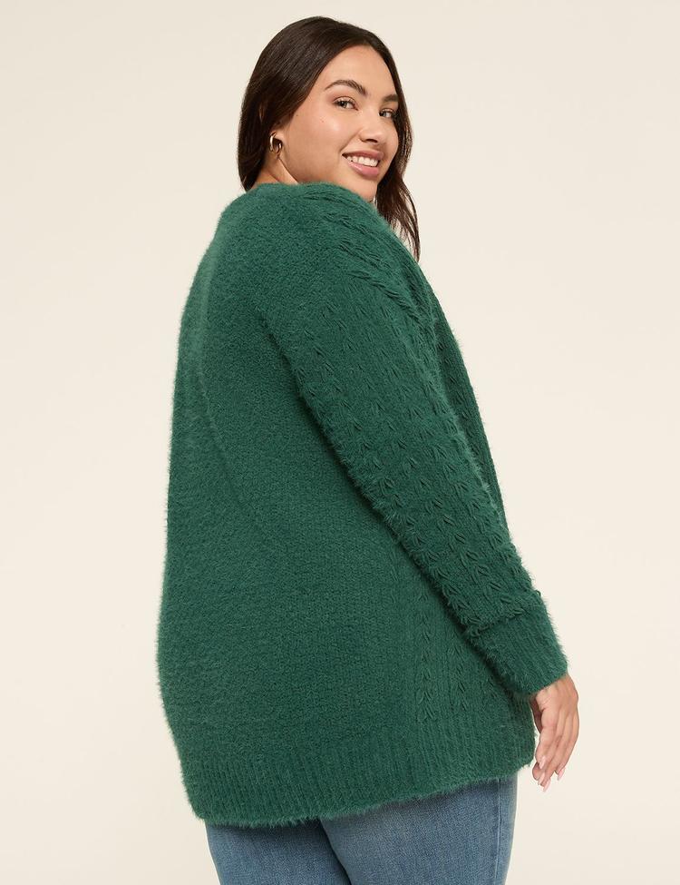 Available in Plus Size Every stitch tells a story - and in this cardi's case, it weaves together a soft-textured tale of layering potential. FIT: Classic. Designed for curves and a not-too-tight, not-too-loose, just-right fit. Front Length (On Body): 33" Longer length is perfect for added coverage FEATURES: Open front Long drop shoulder sleeves Ribbed trim FABRIC: Soft-textured sweater knit with the perfect amount of stretch TURN INSIDE OUT, MACHINE WASH COLD WITH LIKE COLORS, GENTLE CYCLE,ONLY NON-CHLORINE BLEACH WHEN NEEDED, TUMBLE DRY LOW, COOL IRON IFNEEDED. 63% POLYESTER 22% NYLON 15% RAYON Item Number #413233 Imported Plus Size Top ". Plus Size Open-Front Stitch Cardigan, in Dark Green, 10/12, Women's, Lane Bryant