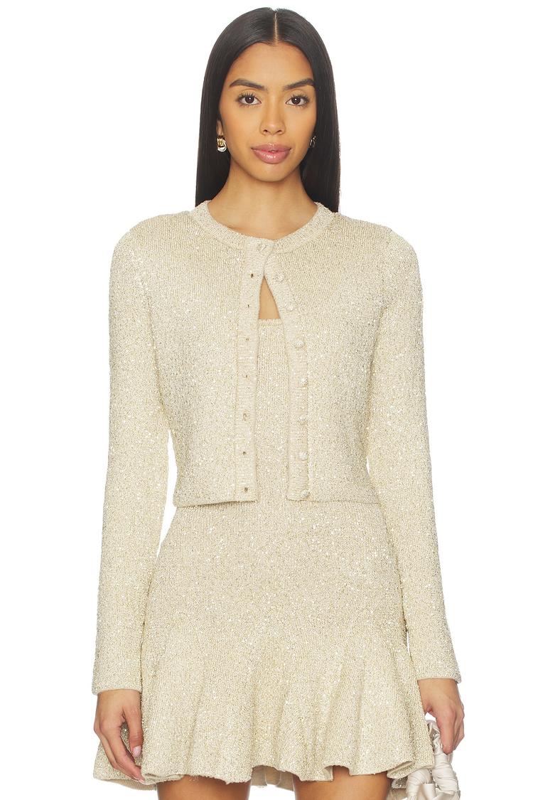 This Loveshackfancy Ferra Cardigan showcases a fitted, cropped silhouette crafted from a midweight sequin knit fabric blending polyester and viscose for subtle shimmer and texture. It features a round neckline, long regular sleeves, and front button closure with ribbed trim, adding delicate romantic elegance. The all-over sequin detailing in a light cream shade enhances its chic appeal. Perfect for casual outings, brunch dates, or sophisticated day-to-night looks during spring and autumn, this cardigan lends a refined, polished touch to your layered ensembles.