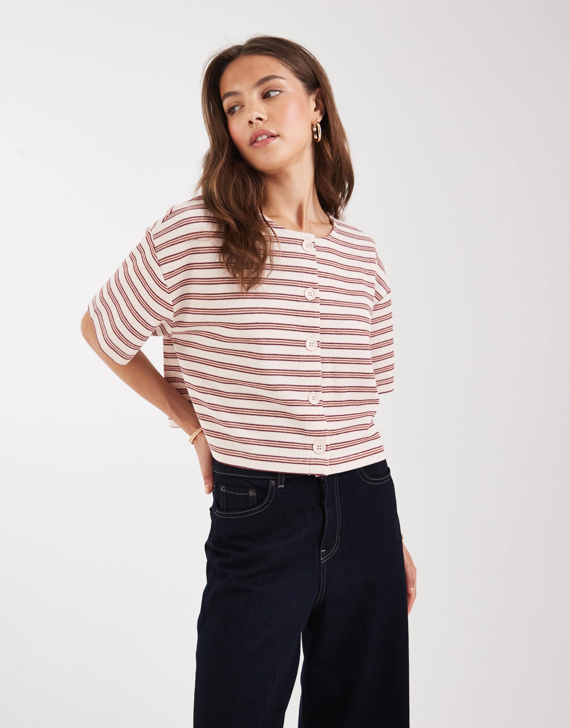 This cropped button-up cardigan features a ribbed knit texture and a classic round neck, delivering casual chic style with a comfortable regular fit. The drop-shoulder half sleeves and striped pattern in off-white and dusty rose hues create a soft, versatile look perfect for spring through autumn wear. Crafted from a polyester and cotton blend, it offers breathable comfort for casual outings, brunches, or relaxed loungewear days. The front button placket adds functional detail while maintaining minimalist appeal.