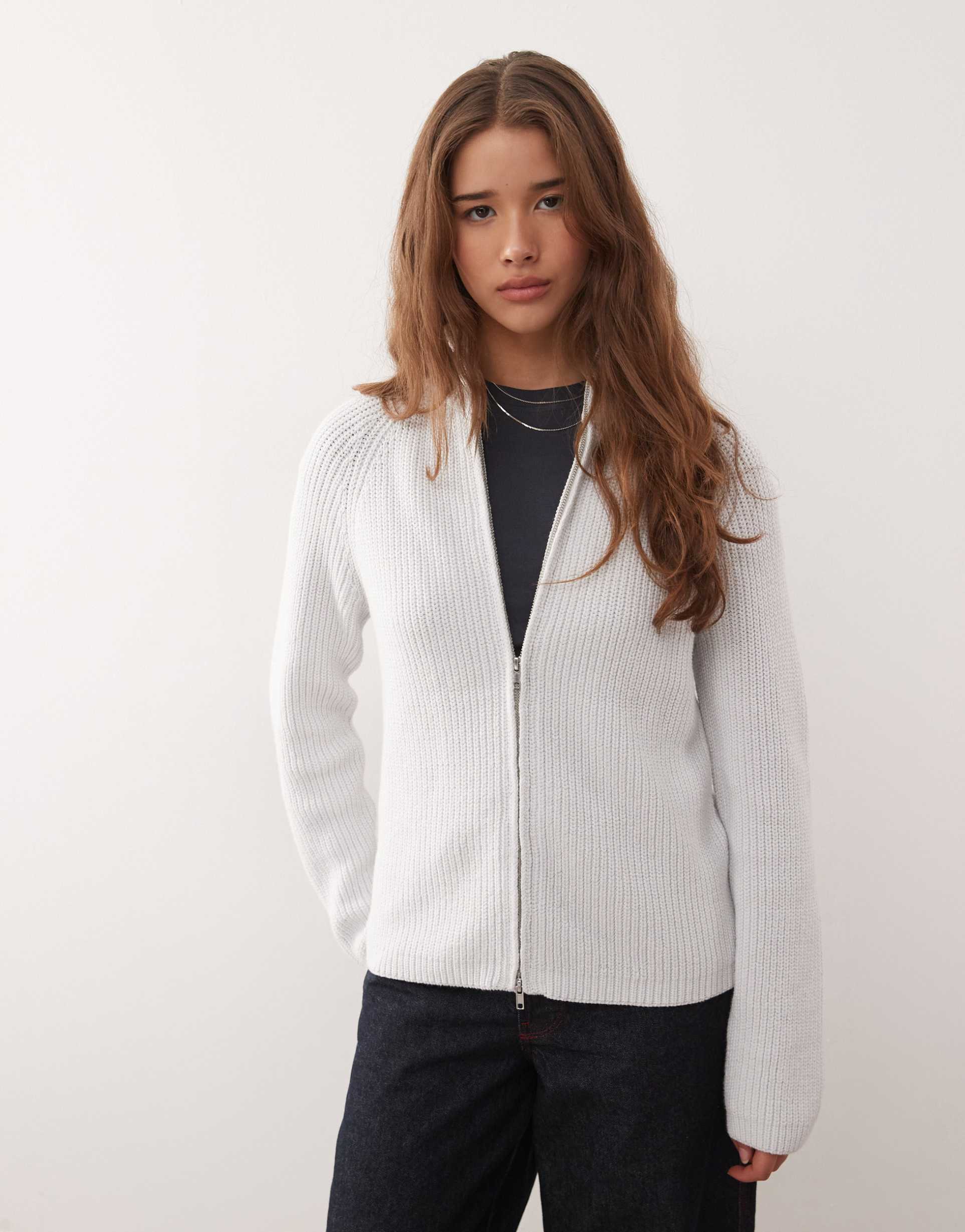 This Monki rib knit cardigan features a soft light gray hue with a chunky textured knit that adds cozy dimension. The hip-length silhouette offers a regular fit, complemented by long, regular sleeves and a high neck for warmth. A practical two-way front zipper closure enhances versatility. Crafted from a cotton-polyamide blend, this sweater is ideal for casual, loungewear, and workwear occasions in cooler seasons. The minimalist and casual chic style makes it a versatile layering piece for everyday wear.