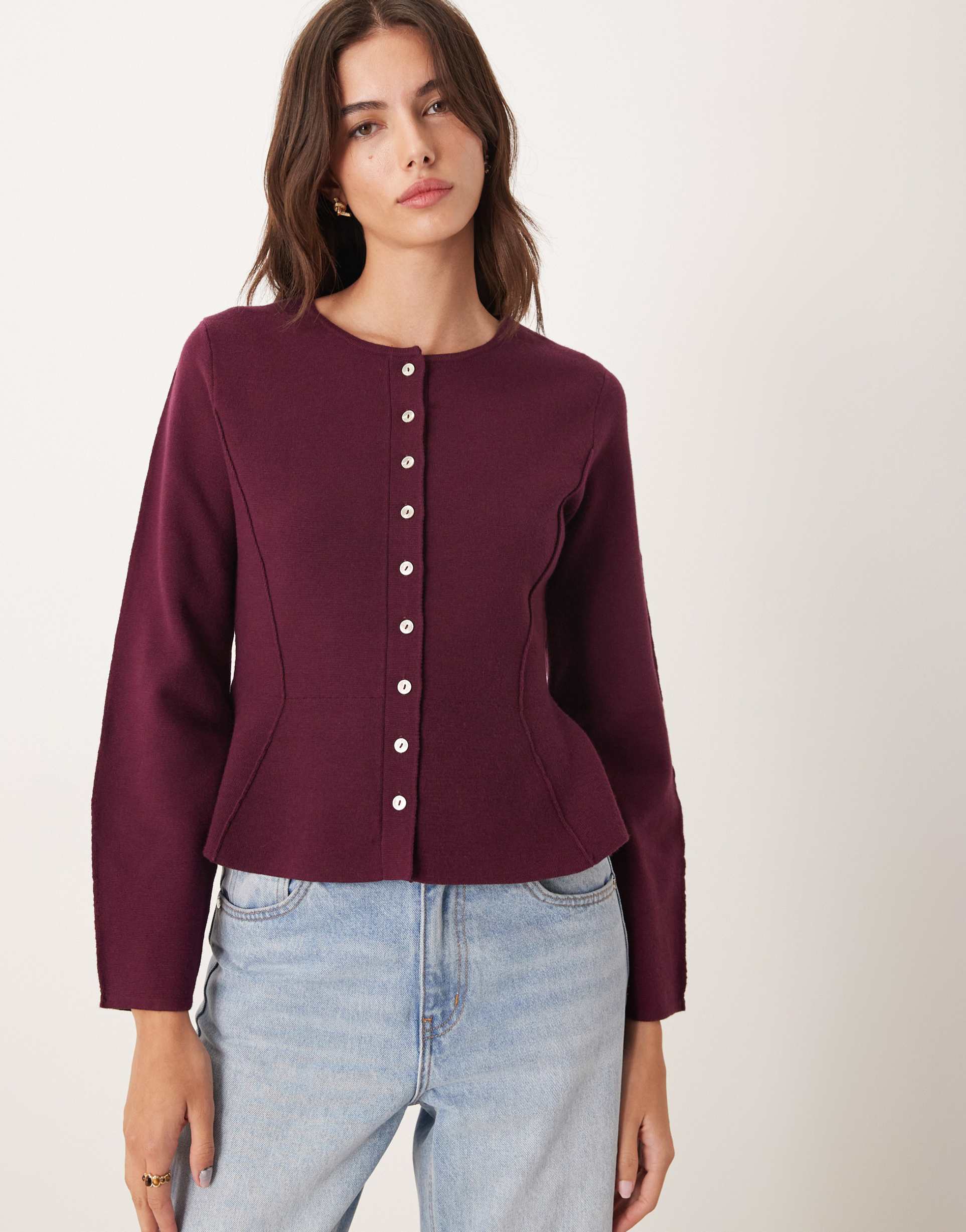 This peplum waist cardigan in a dusty plum hue features a classic crew neckline and long regular sleeves, crafted from a fine knit blend of viscose, nylon, and polyester for comfortable wear. The button-front closure with a button placket complements the regular fit silhouette, making it an ideal choice for casual outings, loungewear, or workwear layering during autumn, winter, and spring seasons. Its waist-length cut and subtle seam detailing add refined structure without overwhelming the minimalist design.