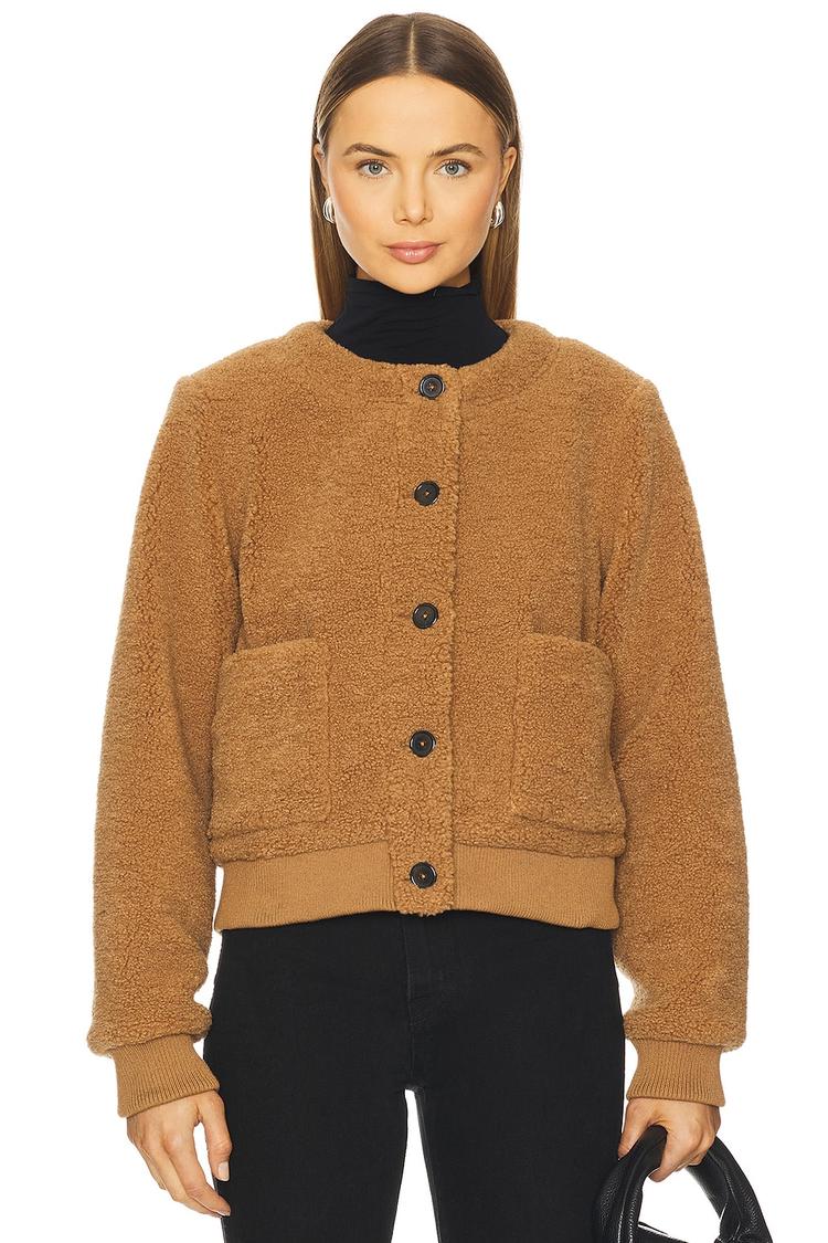 This Sanctuary teddy cardigan features a cozy blouson silhouette with a waist-length fit, crafted from soft, fuzzy polyester knit fabric in a matte tan hue. It has a round neckline and long regular sleeves, finished with a front button closure and practical slip pockets. The textured knit adds tactile interest, making it an ideal casual chic layering piece for autumn and winter. Its regular fit and minimalist style suit casual outings, loungewear comfort, and travel convenience.