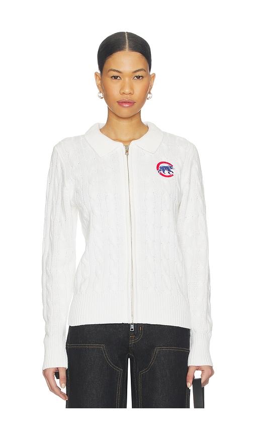 TEREZ X REVOLVE CHICAGO CUBS ZIP KNIT CARDIGAN IN WHITE.