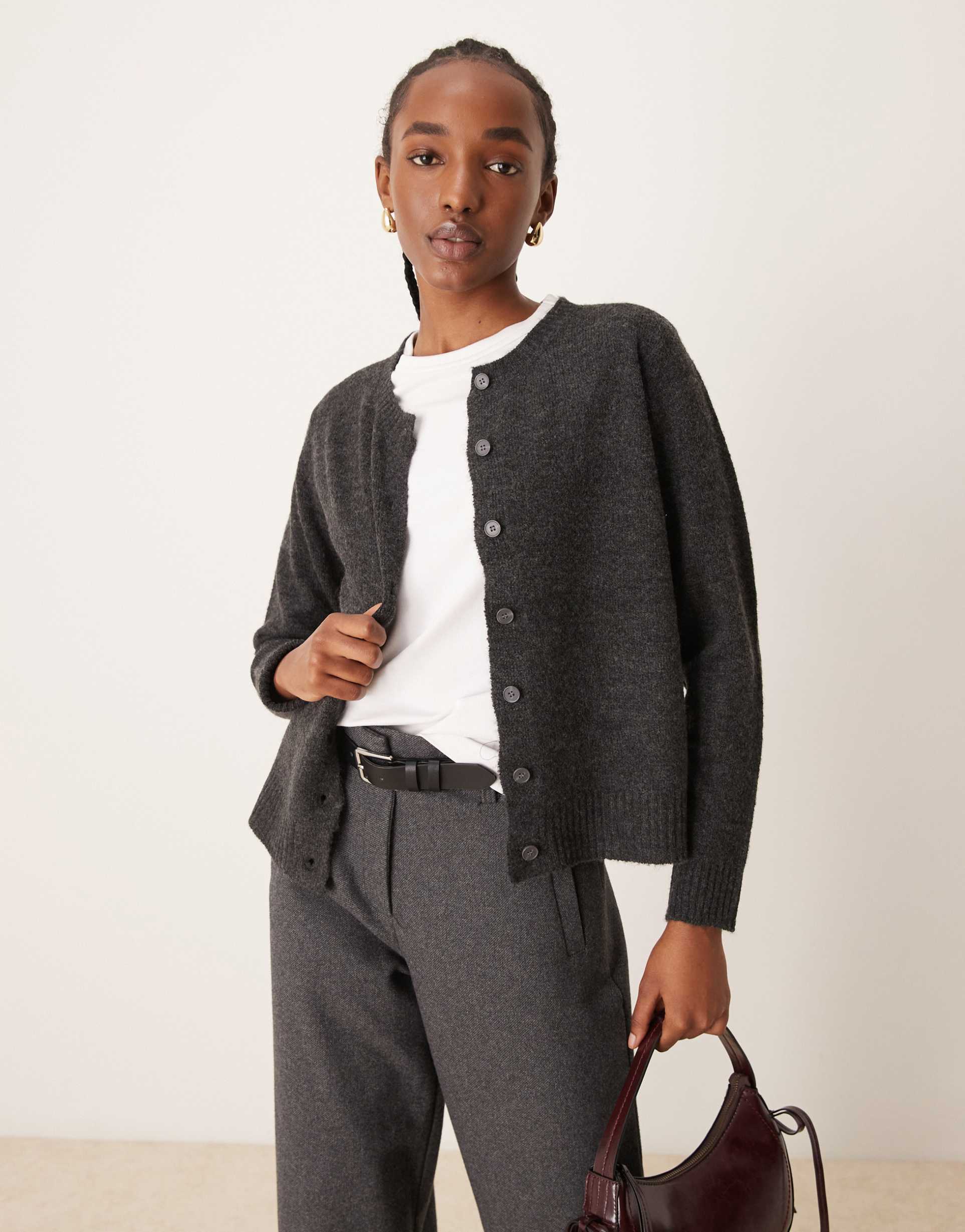 This Vila knit cardigan in a matte dark gray hue offers a cozy yet chic layer with its fine knit fabric blend of acrylic, polyester, and elastane. Featuring a classic crew neck and a button placket closure, it provides long sleeves and a regular fit that hits at hip length. The textured knit adds subtle visual interest, making it perfect for casual, workwear, or business casual occasions during autumn, winter, and spring seasons. Its versatile design pairs effortlessly with tailored trousers or casual outfits.