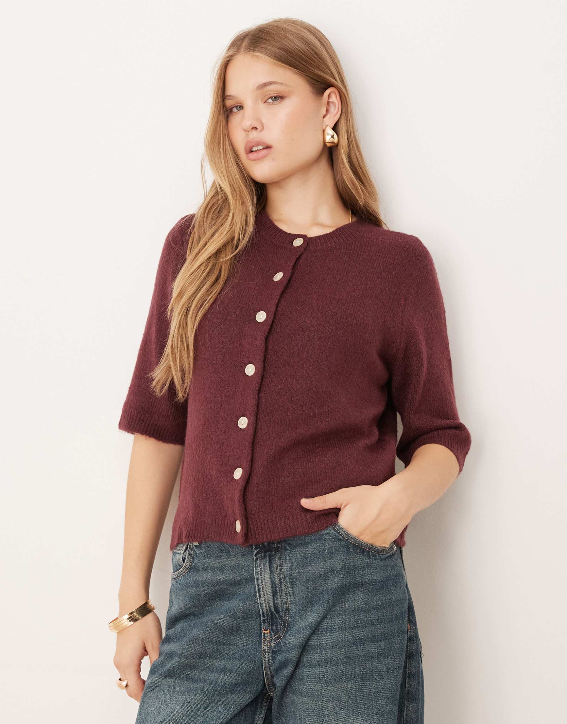 VILA SHORT SLEEVE KNIT CARDIGAN IN BURGUNDY MELANGE