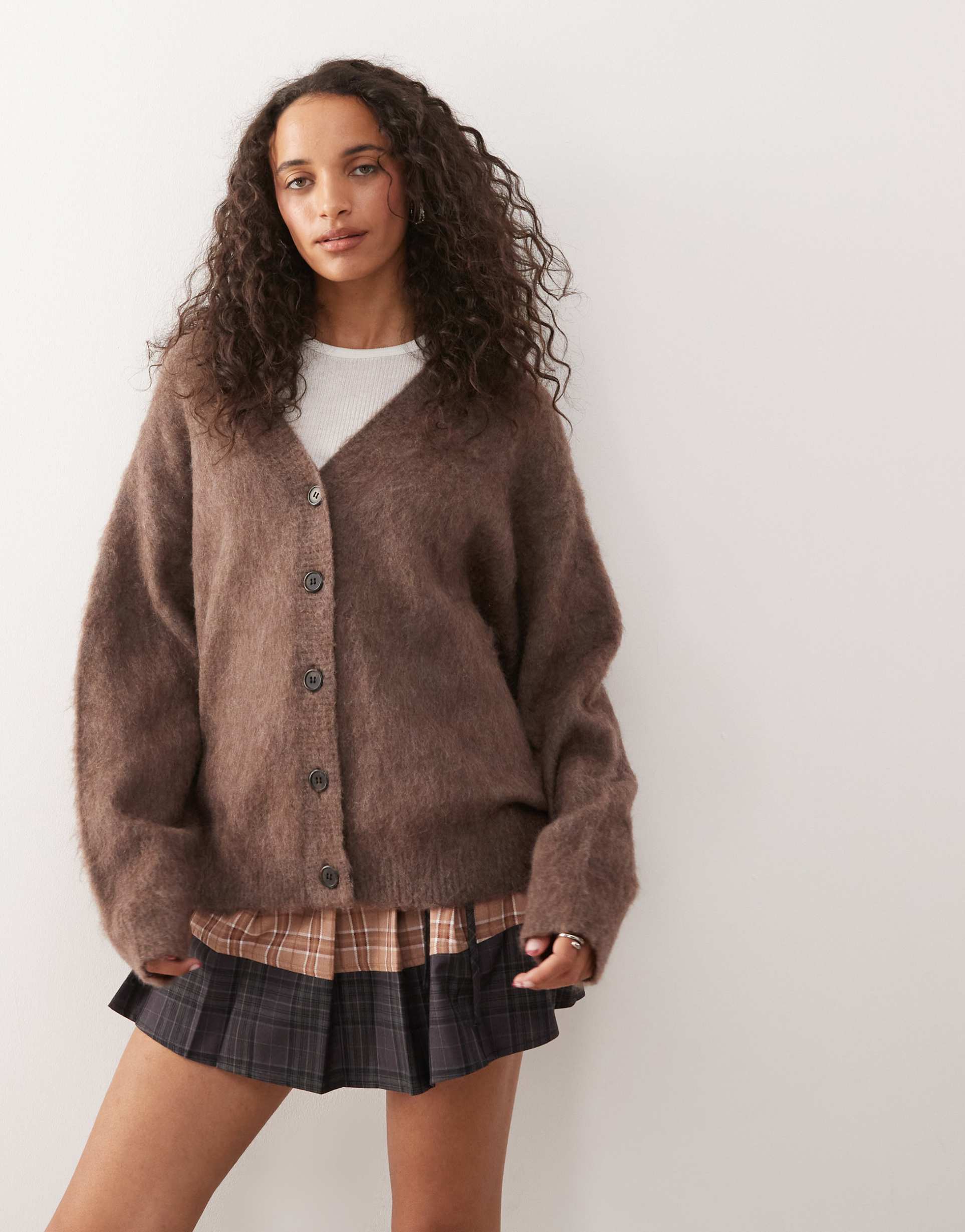 This Weekday cardigan showcases a soft, fluffy knit in a mole melange brown hue, crafted from a premium blend of wool, mohair, and polyester. Featuring a classic V-neck and long sleeves, it offers a regular fit that drapes to hip length for comfortable, casual layering. The button-front closure enhances its minimalist style, making it an ideal choice for autumn and spring casual wear, loungewear, or relaxed workwear settings. Its textured fabric adds subtle visual interest, while the cozy construction ensures warmth without bulk.