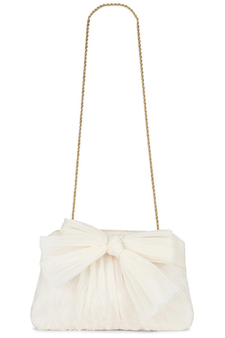 Meet your new go-to for evening polish: the Loeffler Randall Rayne Pleated Bow Clutch. A pristine ivory organza exterior gathers into a delicate bow, perched above a structured frame that snaps securely closed. Inside, satin twill lining keeps essentials protected while a detachable gold-tone chain strap lets you wear it as a graceful shoulder bag or carry it as a clutch. With a single, spacious main compartment, this elegant accessory elevates everything from a wedding guest dress to a midnight date night. Timeless, versatile, and irresistibly chic—it's the statement finish every evening deserves.