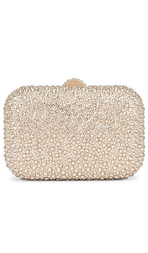 OLGA BERG CASEY HOT FIX ENCRUSTED CLUTCH IN METALLIC GOLD.