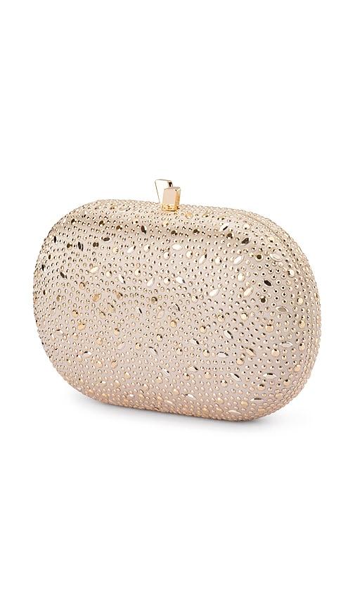 OLGA BERG FAYE OVAL CLUTCH IN METALLIC GOLD.