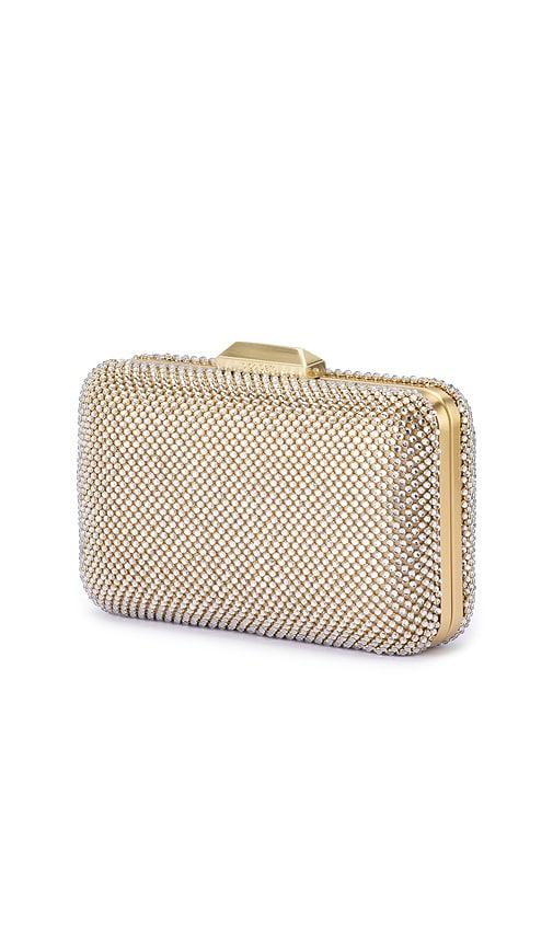 OLGA BERG RONNY CRYSTAL MESH CLUTCH IN METALLIC GOLD.