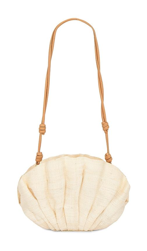 POOLSIDE THE ORIGAMI BEADED SCALLOP CLUTCH IN BROWN.