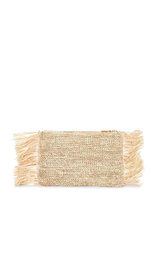 POOLSIDE THE TROPICAL FRINGE CLUTCH IN BEIGE.