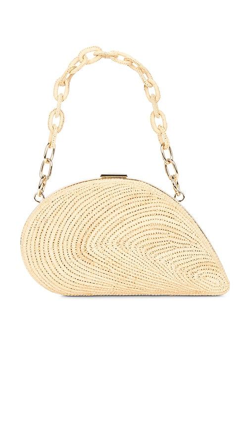 SIMKHAI BRIDGET RAFFIA OYSTER SHELL CLUTCH IN NEUTRAL.