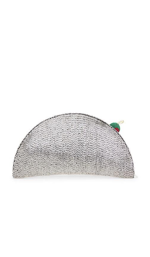 SIMONMILLER BEADED LUNE CLUTCH IN METALLIC SILVER.