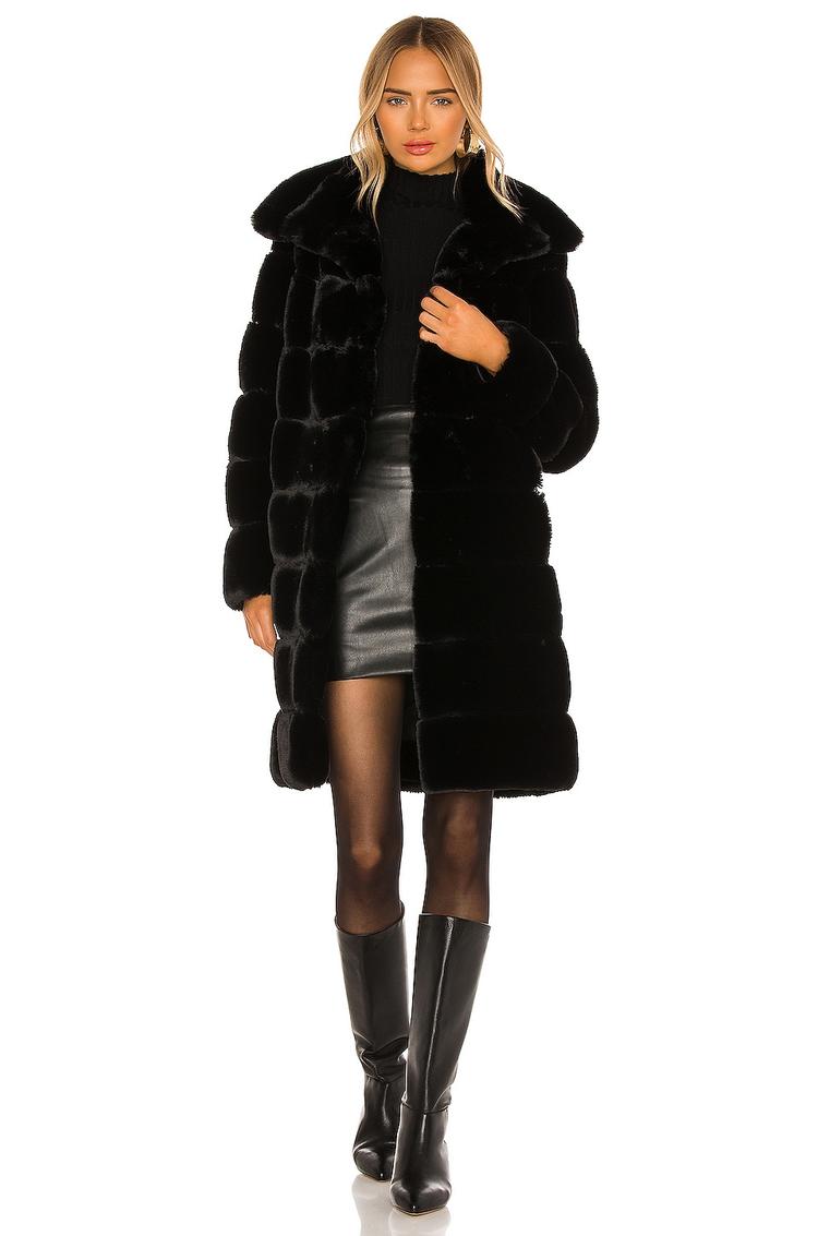 This knee-length longline faux fur coat features a luxurious black polyester fabric with a soft, voluminous texture. Designed with a relaxed fit, it includes a classic turn-down collar and long regular sleeves. The front hook and eye closure enhances its clean silhouette, while side welt pockets add functional appeal. Perfect for autumn and winter, this elegant and chic coat suits casual outings, travel, and outdoor events, providing warmth and sophisticated style with timeless appeal.
