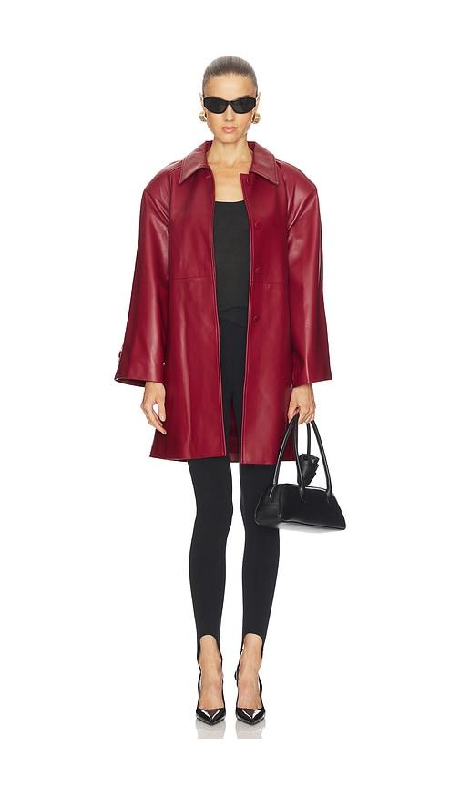 AEXAE LEATHER PADDED MIDI COAT IN RED.