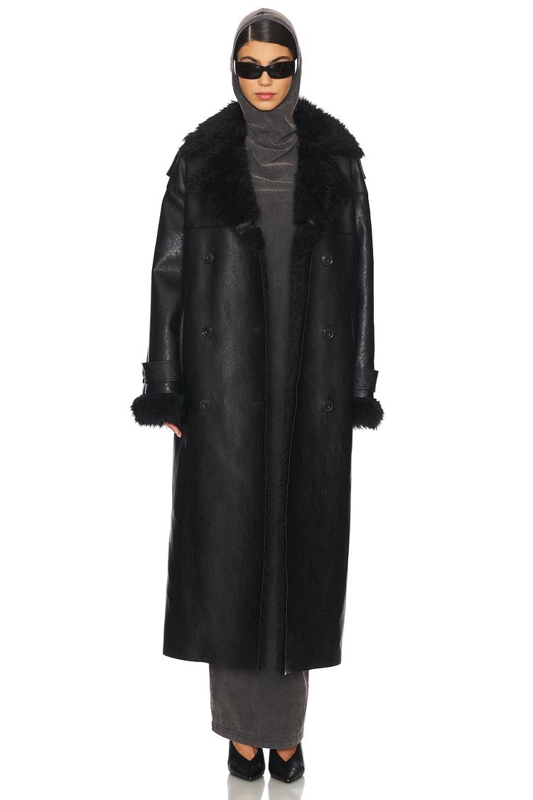 This Beverly Coat features a sleek, longline silhouette with a single-breasted front and classic notched lapel collar. Crafted from heavyweight textured polyester sherpa fabric, it offers warmth and a sophisticated matte black finish. The coat has long regular sleeves with turned-up sherpa cuffs and front slant welt pockets for practicality. Its regular fit and full length make it ideal for autumn and winter wear. Perfect for casual outings, workwear, and travel, this minimalist and timeless piece combines comfort and elegance effortlessly.