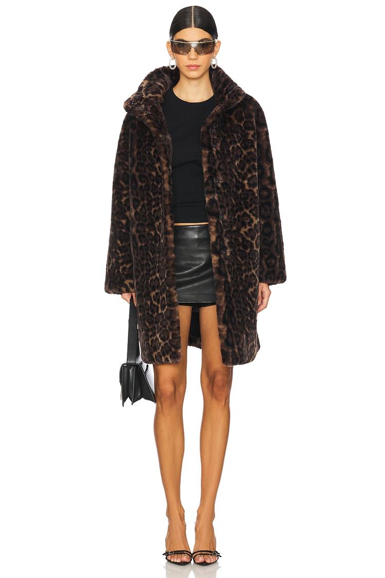 This mid-length car coat features a chic leopard animal print in black and brown hues. Crafted from faux fur polyester fabric with a smooth polyester lining, it offers warmth and softness ideal for autumn and winter seasons. The relaxed fit and thigh-length cut provide comfortable coverage, complemented by a stand collar and long regular sleeves. A hidden snap button closure and side seam pockets add practical functionality while maintaining a sleek silhouette. Perfect for casual outings, workwear, or stylish night outs, this coat embodies classic yet trendy outerwear elegance.