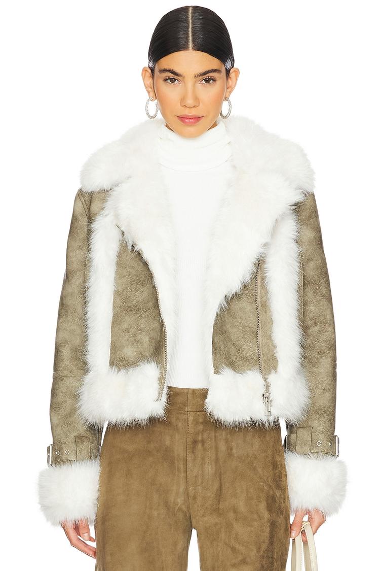 This edgy biker-moto jacket features a distressed matte brown faux leather body contrasted with plush matte white faux fur trim along the collar, cuffs, front, and back. The waist-length jacket has a regular fit with long sleeves and classic lapels, creating a modern silhouette. Functional side seam pockets and belted cuffs add utility and style. The exposed front zipper closure enhances its urban vibe. Crafted from polyester with faux fur accents, this jacket suits autumn and winter casual streetwear and travel occasions with ease.