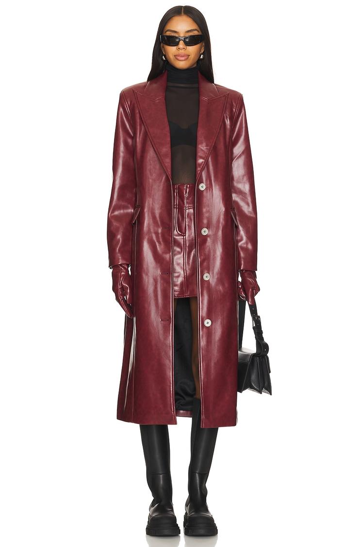 This matte dark red longline single-breasted overcoat features a sleek notch lapel collar and long regular sleeves, extending to calf length for full coverage. Crafted from polyester with a matching polyester lining, it offers a smooth, shiny finish enhancing its modern classic appeal. The coat fastens with front silver buttons and includes dual front pockets for functional style. Its regular fit ensures comfort and versatility, perfect for casual outings, workwear, or business casual occasions during autumn, winter, and spring seasons.