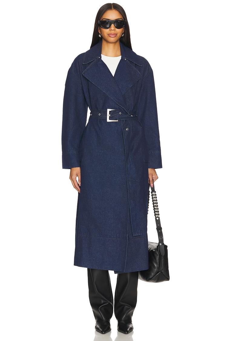This Tate Denim Trench Coat in a deep dark blue cotton fabric offers a classic and minimalist silhouette with a calf-length hem and regular fit. Featuring long sleeves with regular styling and traditional lapels, it fastens with front buttons and includes a detachable belt that cinches the waist for adjustable shaping. The coat is fully lined in recycled polyester, adding eco-conscious comfort. Its covered back and belted waist details enhance its timeless appeal, making it ideal for casual outings, workwear, or business casual occasions during autumn, winter, and spring.