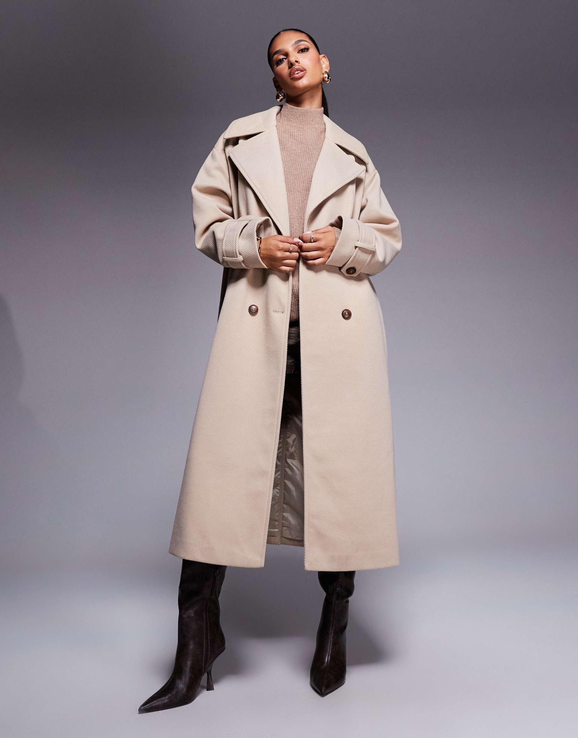 ARIA COVE WOOL LOOK HEAVYWEIGHT COLLARED TRENCH STYLE MAXI COAT IN BEIGE