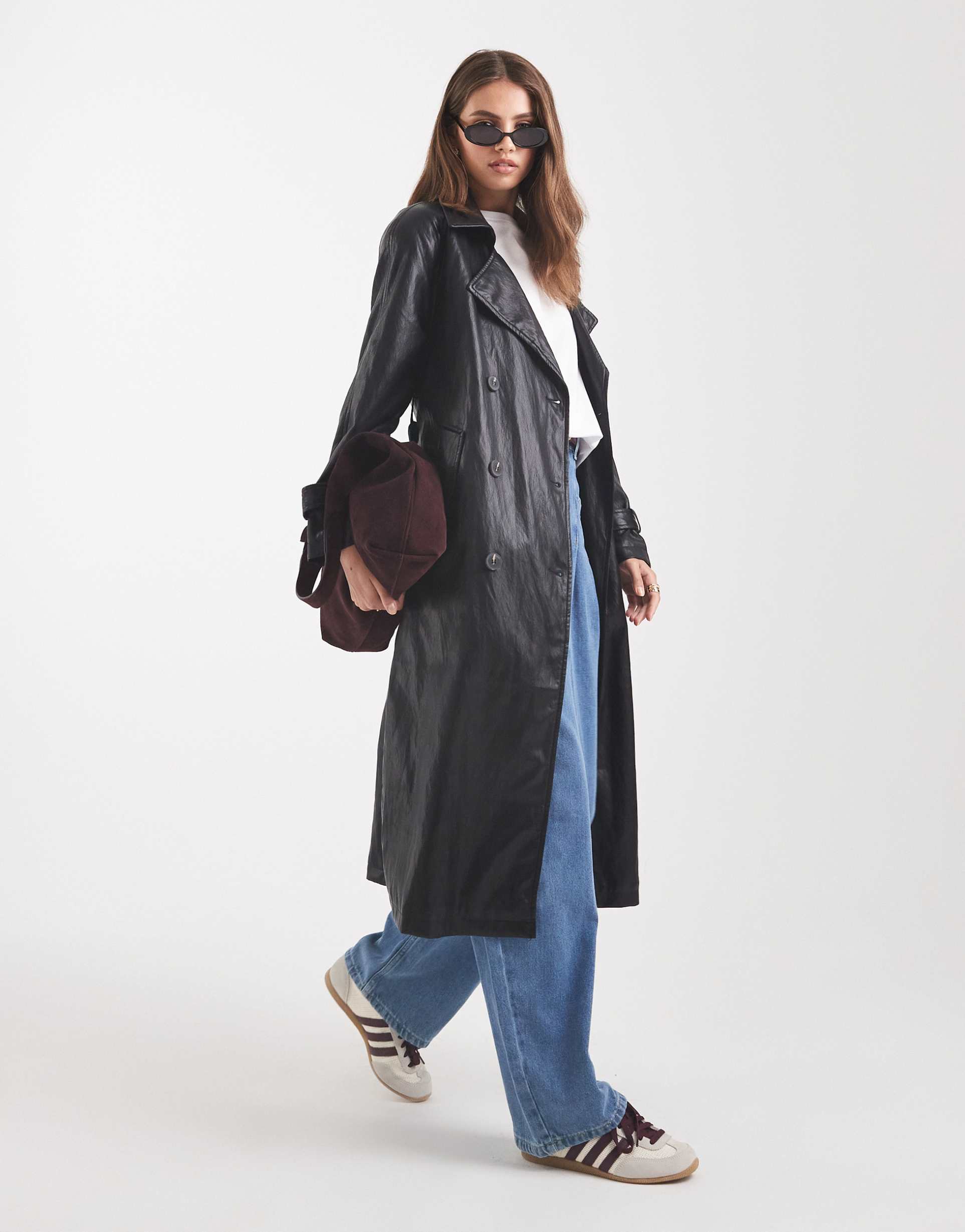 ASOS DESIGN LEATHER LOOK TRENCH COAT IN BLACK