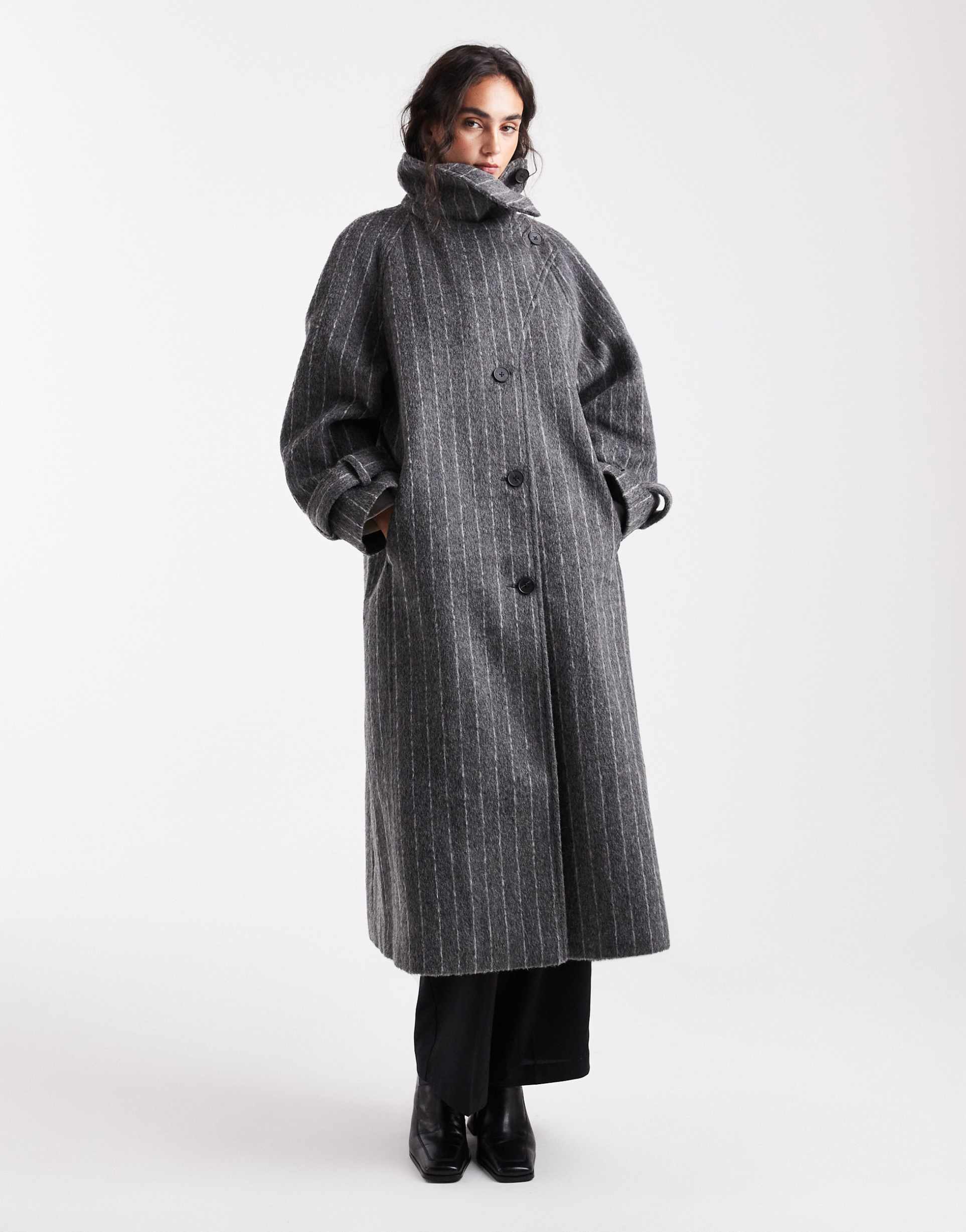 ASOS DESIGN LONGLINE WOOL BLEND FUNNEL NECK COAT IN GRAY PINSTRIPE