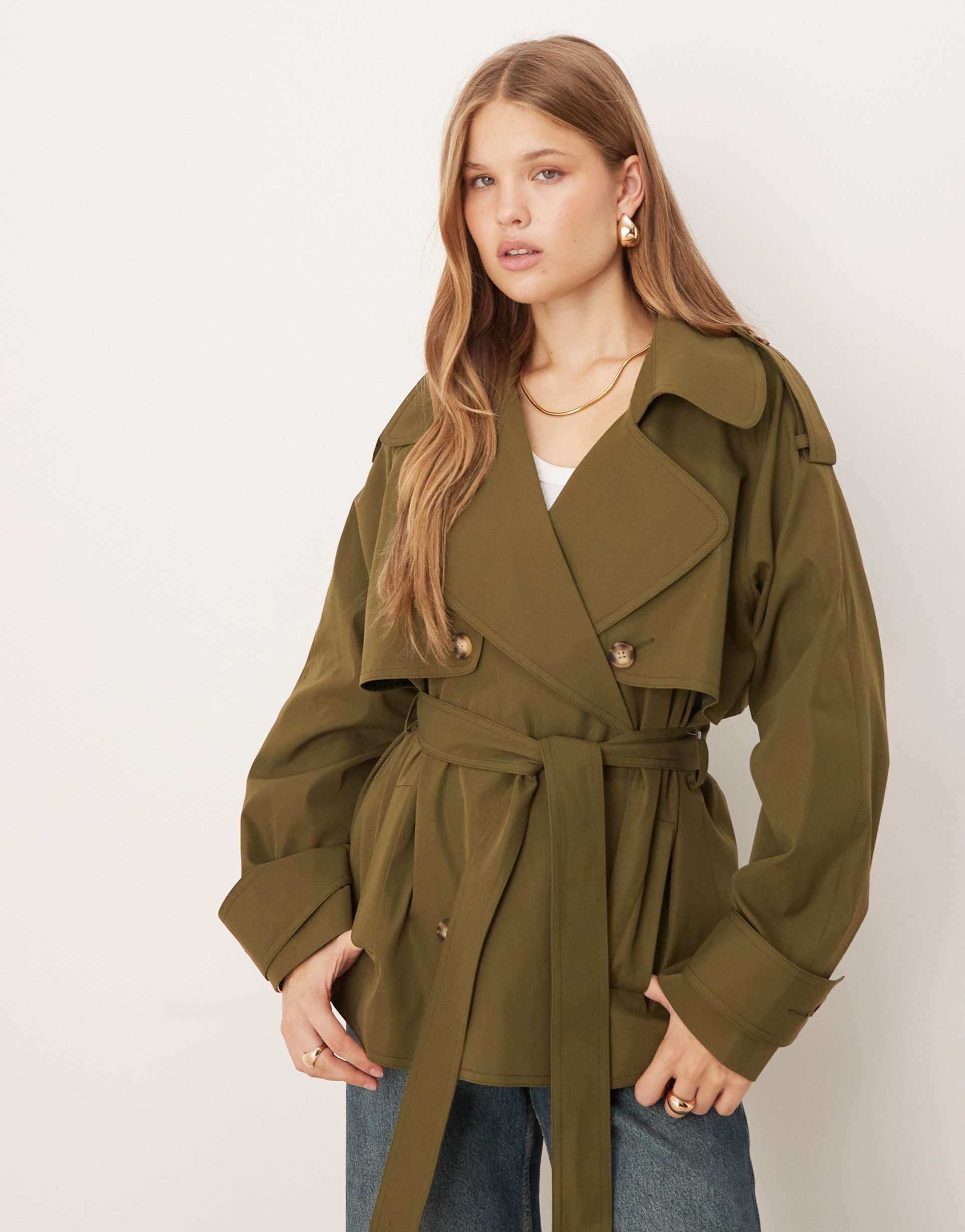 ASOS DESIGN OVERSIZED SHORT TRENCH COAT WITH BELT IN OLIVE