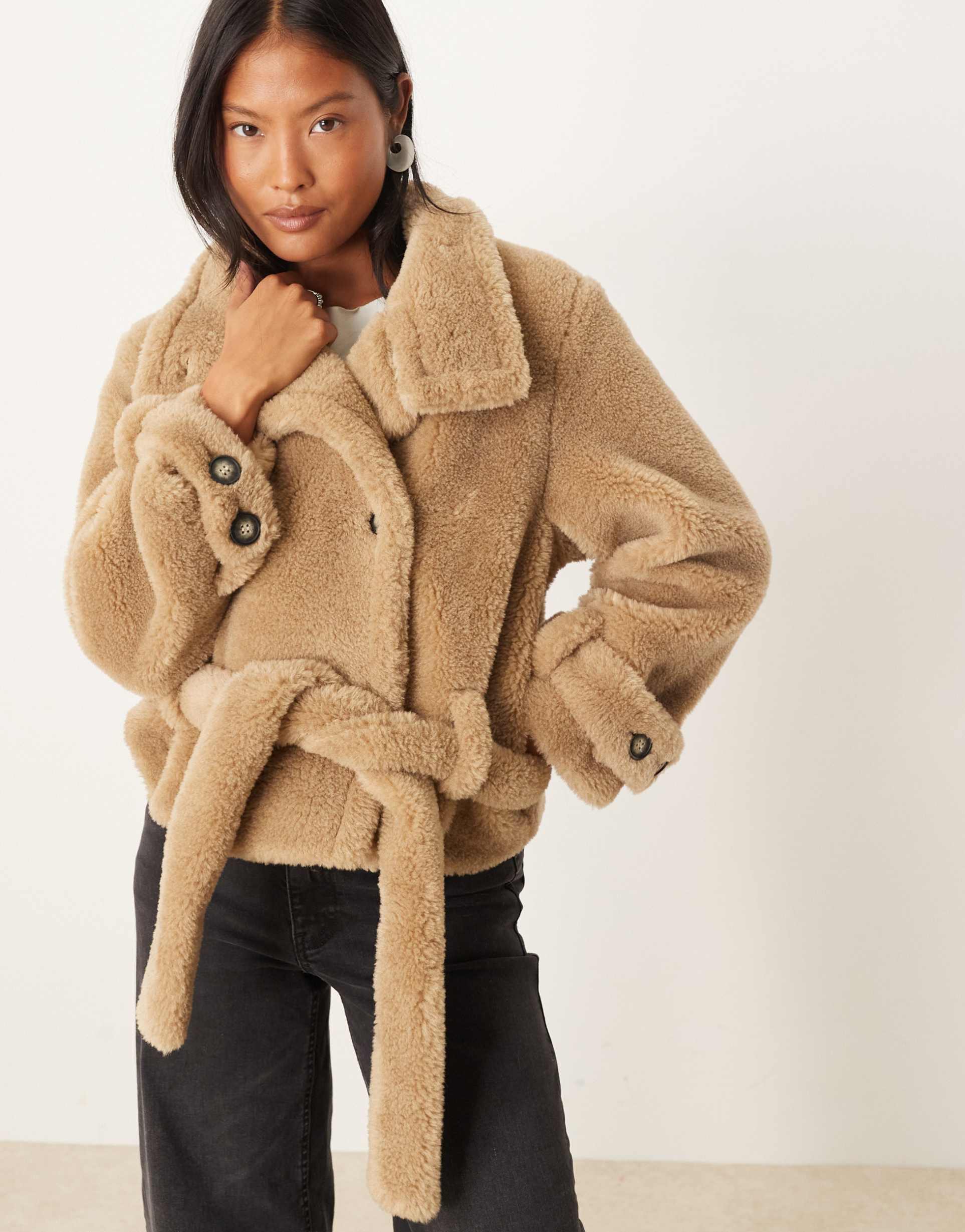 This ASOS DESIGN Petite cropped trench coat features a soft teddy bear texture in a warm beige tone, perfect for autumn and winter layering. The regular fit silhouette is enhanced by a turn-down collar and long, regular sleeves, providing a classic and cozy look. Functional button closure and a belted waist emphasize the shape while adding stylish detail. Made from polyester with a polyester lining, this textured cropped coat is ideal for casual outings, travel, and workwear in cooler seasons.
