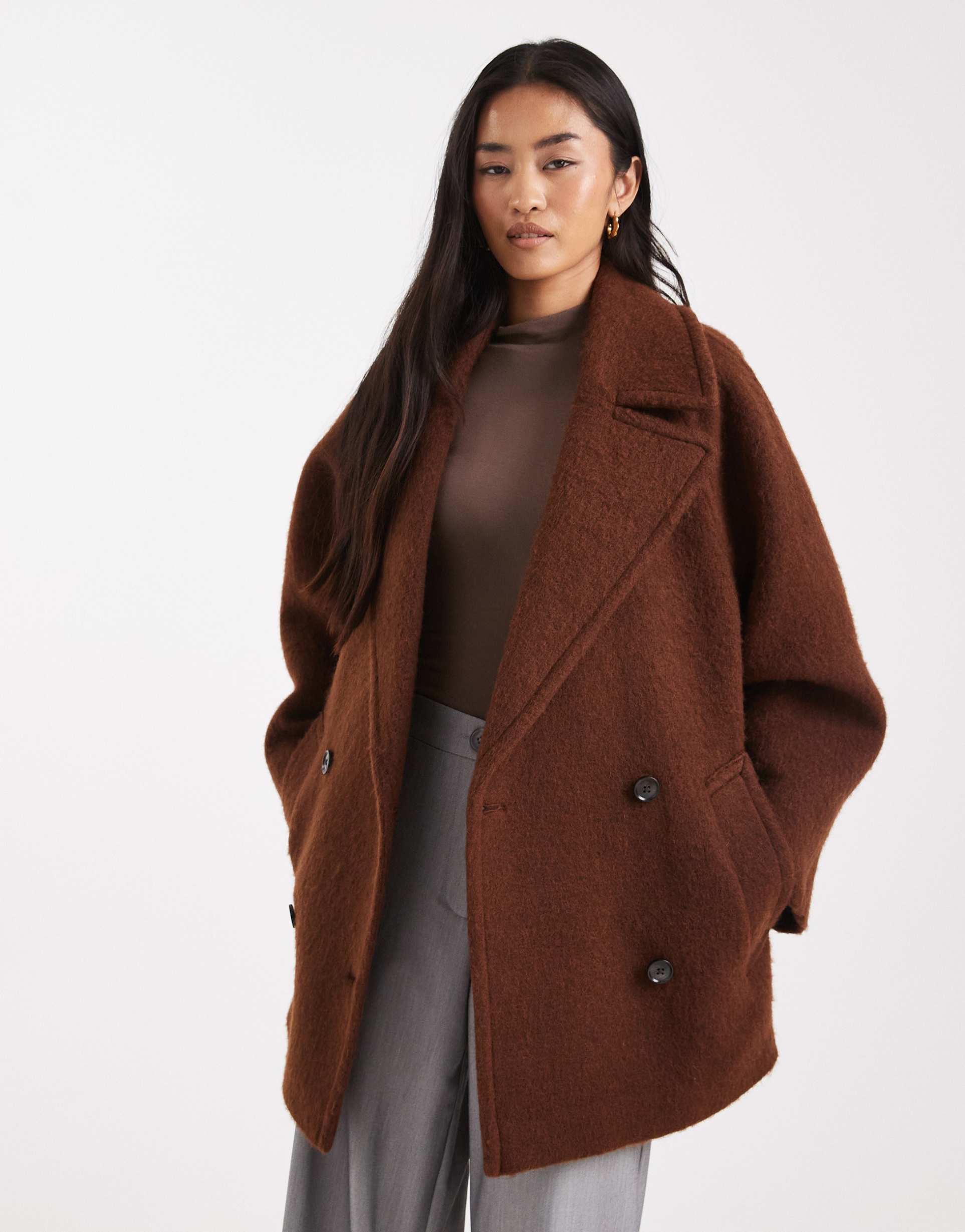 This ASOS DESIGN premium pea coat features a regular fit silhouette in a textured woven wool blend fabric with a matte toffee brown hue. The hip-length coat is detailed with classic notch lapels, a front button closure, long drop-shoulder sleeves, and practical side pockets. Fully lined in smooth polyester, it offers warmth and comfort for autumn and winter seasons. Its minimalist and sophisticated style makes it perfect for casual, workwear, and business casual occasions, combining timeless elegance with everyday functionality.