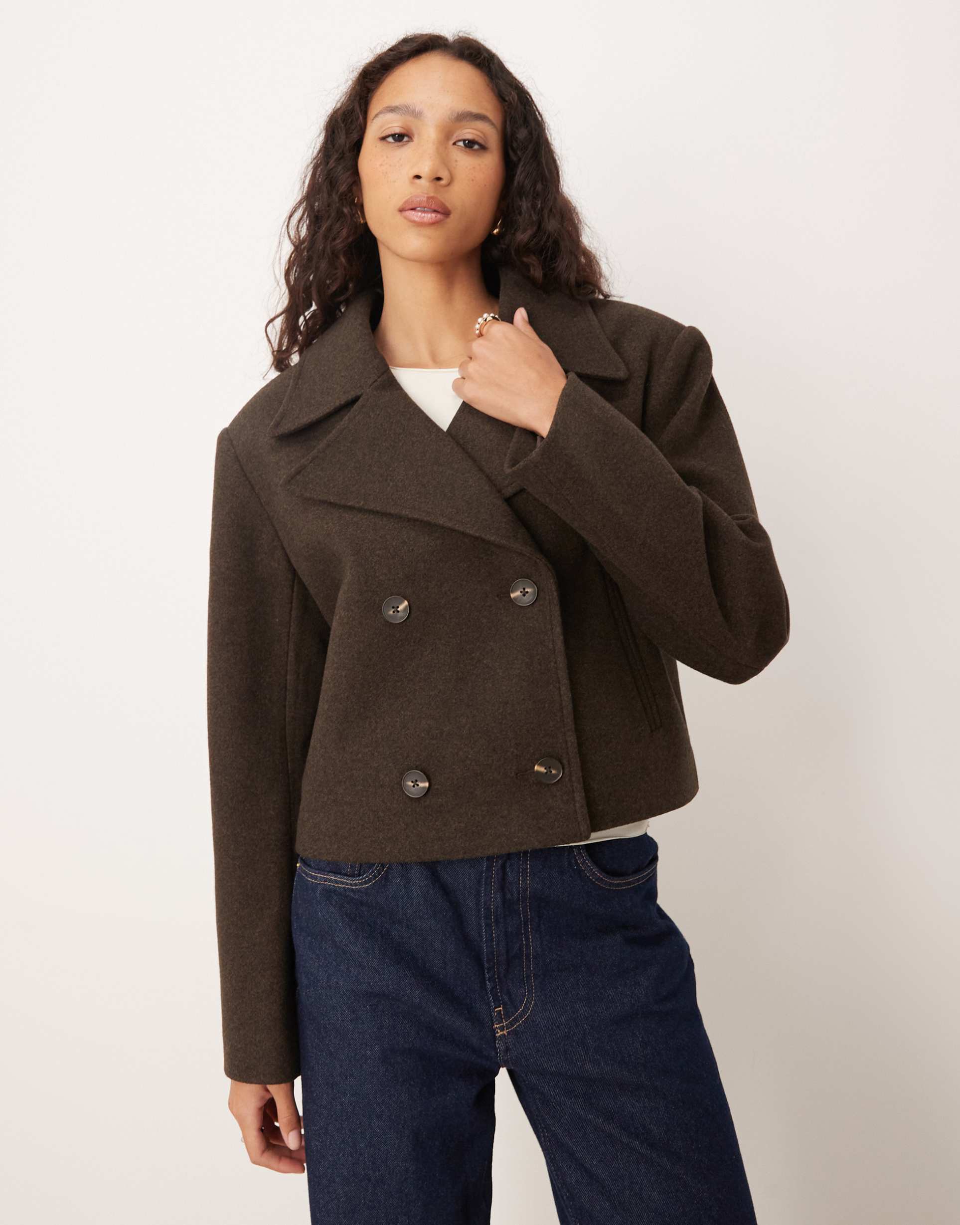 This ASOS DESIGN short formal trench coat features a boxy fit with a cropped length, crafted from a thick, textured matte dark brown polyester fabric. The coat showcases a double-breasted front button closure and a classic spread collar, complemented by long regular sleeves. Fully lined with polyester for added comfort, it combines timeless elegance with minimalist style. Perfect for autumn and winter, this versatile cropped trench coat is ideal for workwear, business casual settings, and semi-formal occasions, offering a chic and polished silhouette.
