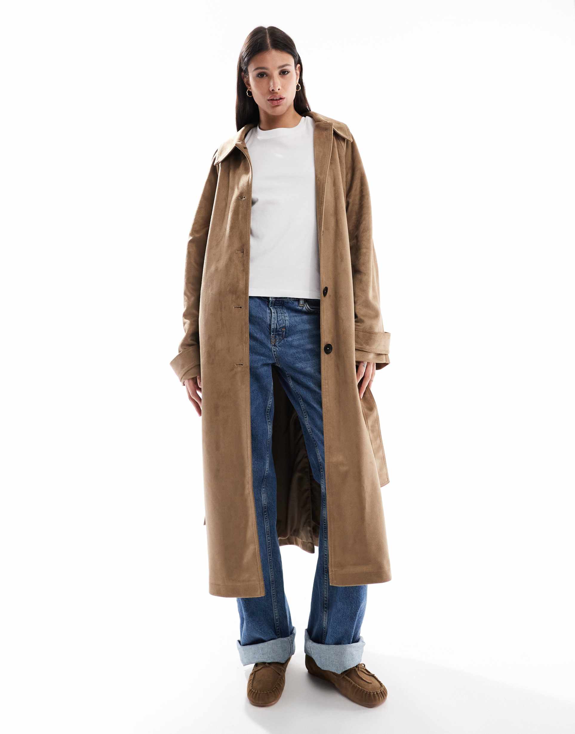 ASOS DESIGN TALL FAUX SUEDE FUNNEL NECK TRENCH COAT IN STONE