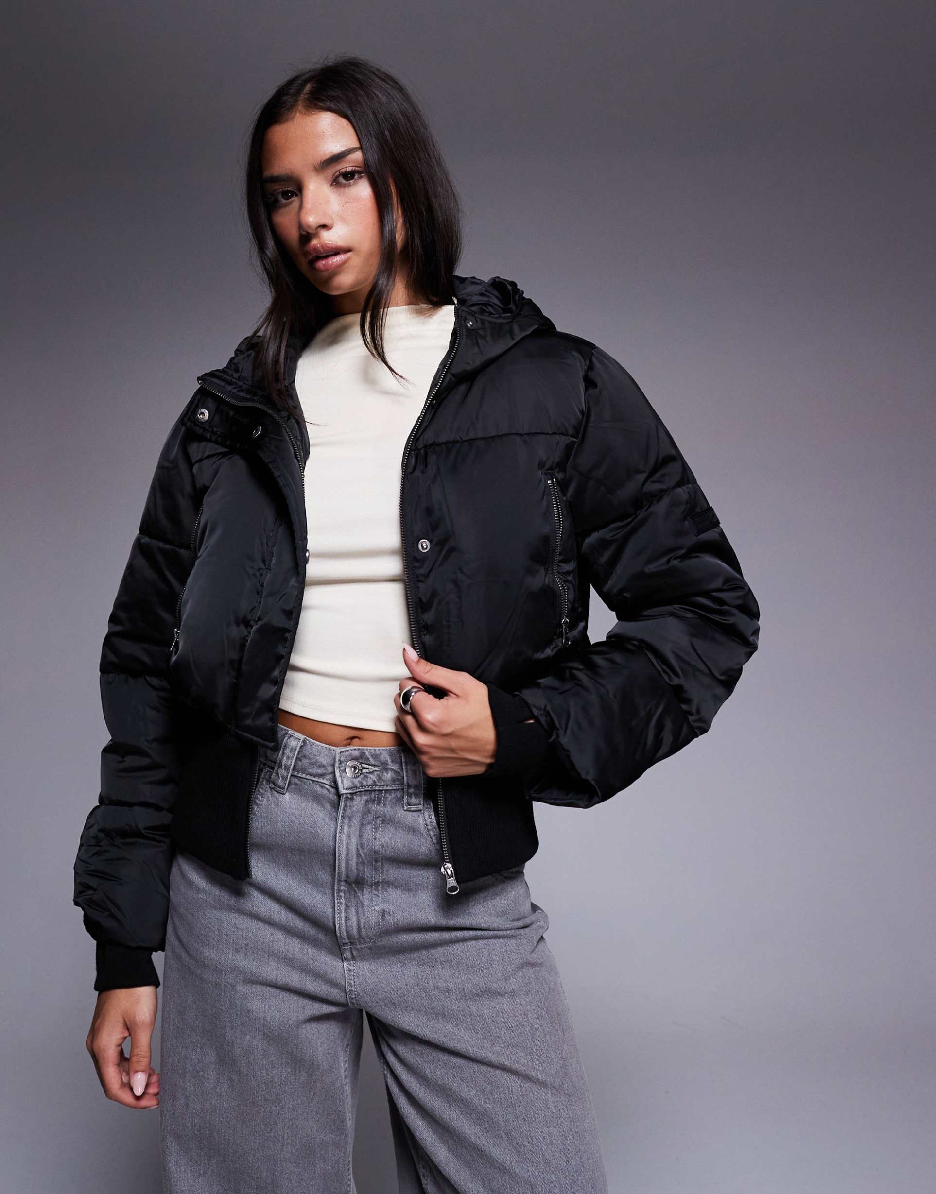 WEEKEND COLLECTIVE CROPPED PADDED COAT WITH RIBBED CORSETED WAIST DETAILING IN BLACK