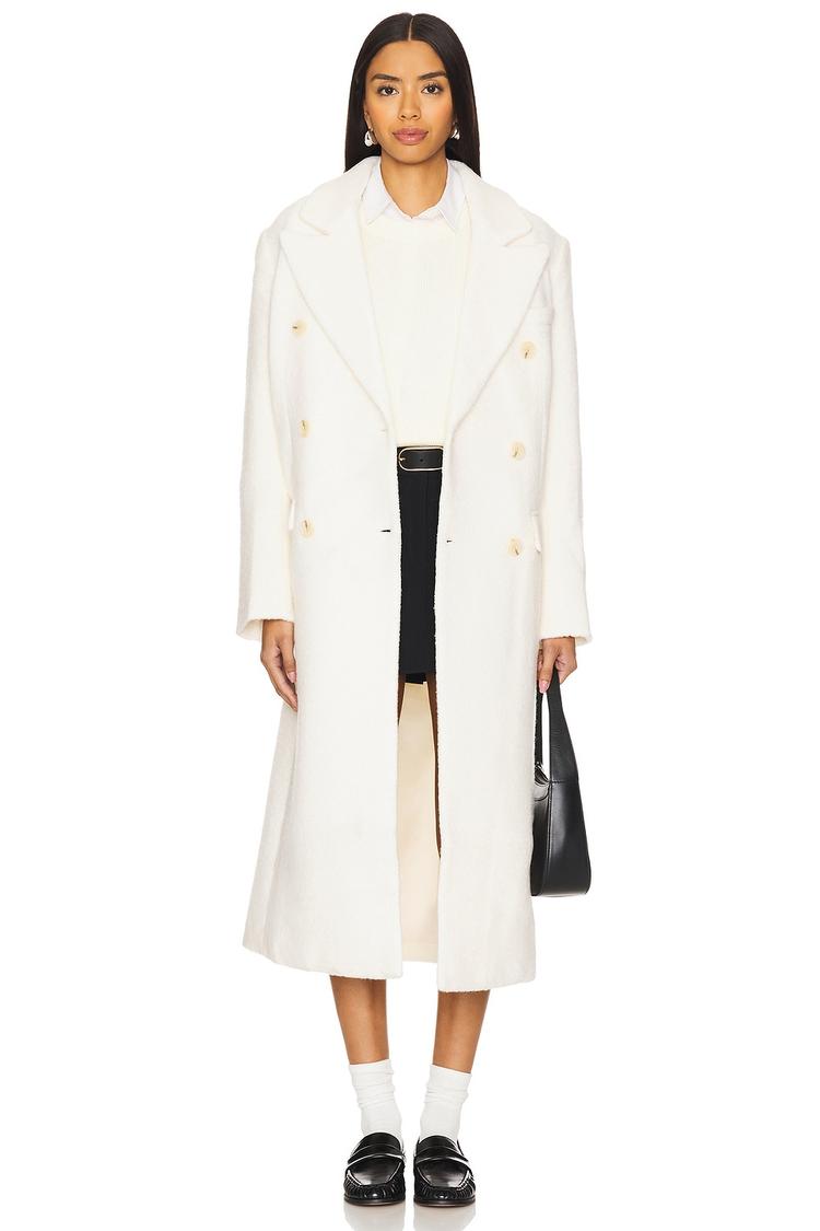 This double-breasted overcoat features a classic notch lapel collar and a calf-length silhouette that offers a regular fit. Crafted from a heavyweight wool and polyester blend with a smooth polyester lining, it ensures warmth and comfort through autumn and winter seasons. The front button closure and elegant button cuffs add refined details, while faux flap pockets and a breast welt pocket provide subtle design touches. Ideal for casual days, workwear, and business casual settings, this off-white coat delivers timeless sophistication and versatile layering options.