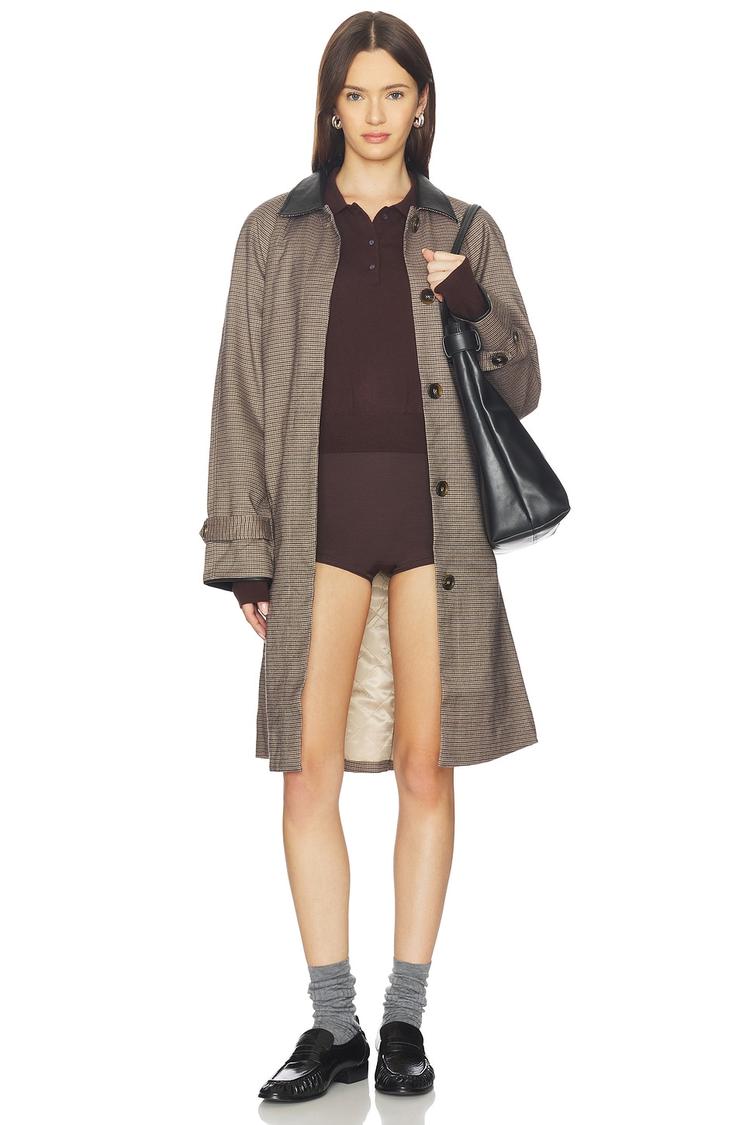 This knee-length single-breasted Raiden Coat features a classic turn-down collar and long regular sleeves, crafted from a midweight polyester houndstooth fabric in muted brown tones. The coat has a regular fit with a back vent for ease of movement and a front button closure, lined with polyester for added comfort. Its minimalist, sophisticated style is perfect for casual, workwear, and travel occasions during autumn, winter, and spring seasons.