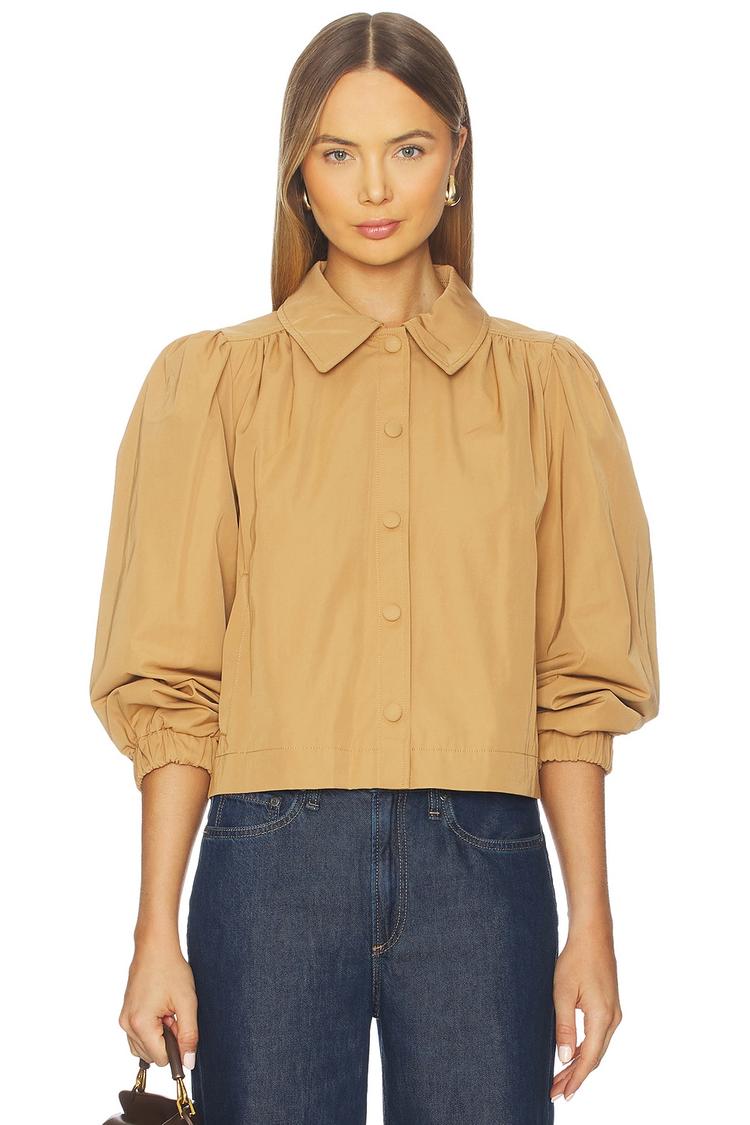 This cropped modern jacket in matte tan features a turn-down collar and long puff sleeves with elasticized cuffs, lending a chic and minimalist silhouette. Crafted from a midweight polyester-cotton ripstop fabric with a smooth polyester lining, it has a snap button front closure and practical front slant pockets. The regular fit and covered back make it versatile for casual, streetwear, or workwear occasions during spring and autumn. Its clean solid color and subtle design details provide effortless style and function.
