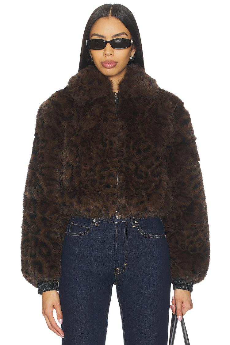 This cropped blouson jacket features a rich dark brown faux fur fabric with an all-over subtle animal pattern. Designed with a turn-down collar and long drop-shoulder sleeves, it offers a relaxed yet trendy fit perfect for casual and streetwear occasions. The jacket includes a front zipper closure and side seam zipper pockets for added functionality. Its quilted polyester and elastane lining ensures warmth and comfort during autumn and winter months. Ideal for nights out or stylish everyday wear, this chic piece blends texture and pattern effortlessly.