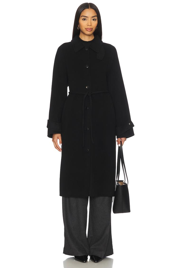 This elegant black wrap coat features a calf-length silhouette crafted from a luxurious wool, nylon, and cashmere blend. Designed with a classic turn-down collar and long regular sleeves, it offers an adjustable fit enhanced by a button front closure and a wrap tie belt at the waist. Buttoned cuffs and side seam pockets add functional detail, while the covered back maintains a clean, minimalist look. Ideal for autumn and winter, this sophisticated coat suits casual outings, workwear, and travel with its timeless style and cozy fabric.