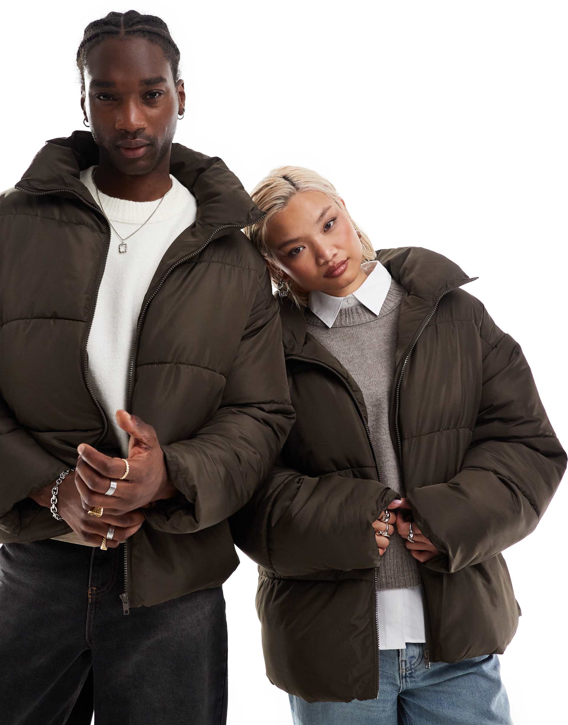 COLLUSION UNISEX PUFFER JACKET IN BROWN