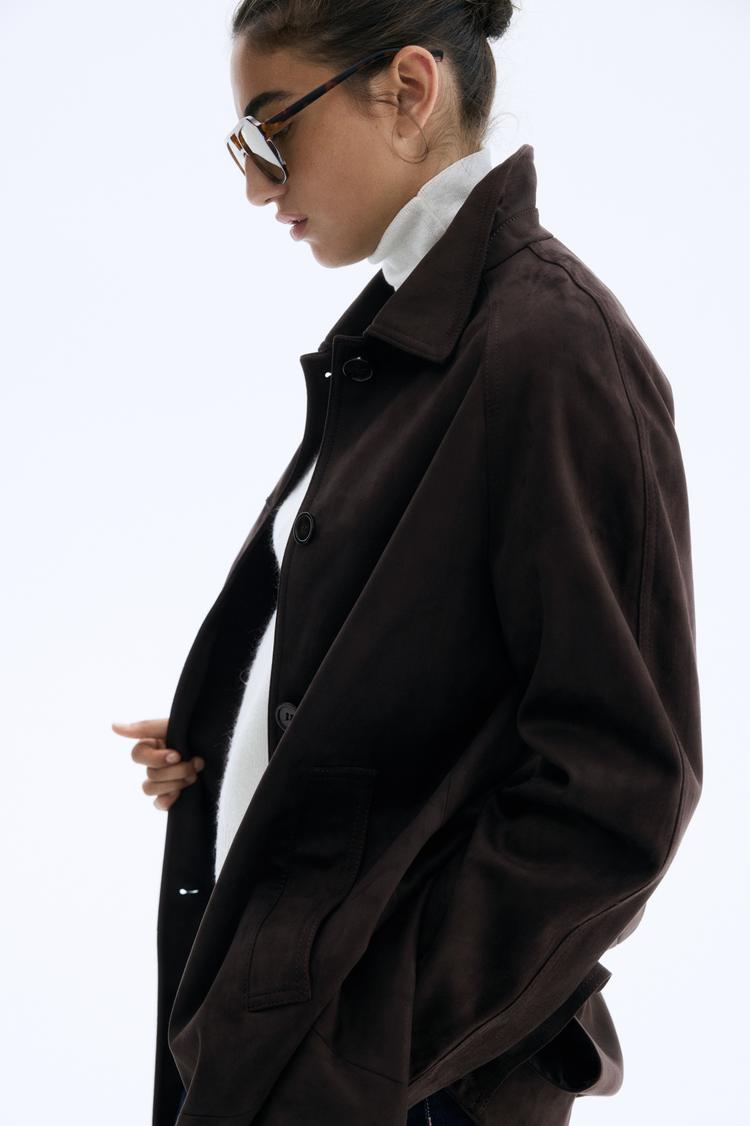 This classic car coat in matte dark brown cotton features a regular fit with a turn-down collar and long regular sleeves. Designed with a hip-length hem and covered back, it fastens with front buttons for a timeless look. The coat includes practical pockets, making it functional for everyday wear. Its minimalist and sophisticated style suits casual, workwear, and business casual occasions, ideal for autumn to spring seasons. The matte finish adds understated elegance to this versatile outerwear piece.