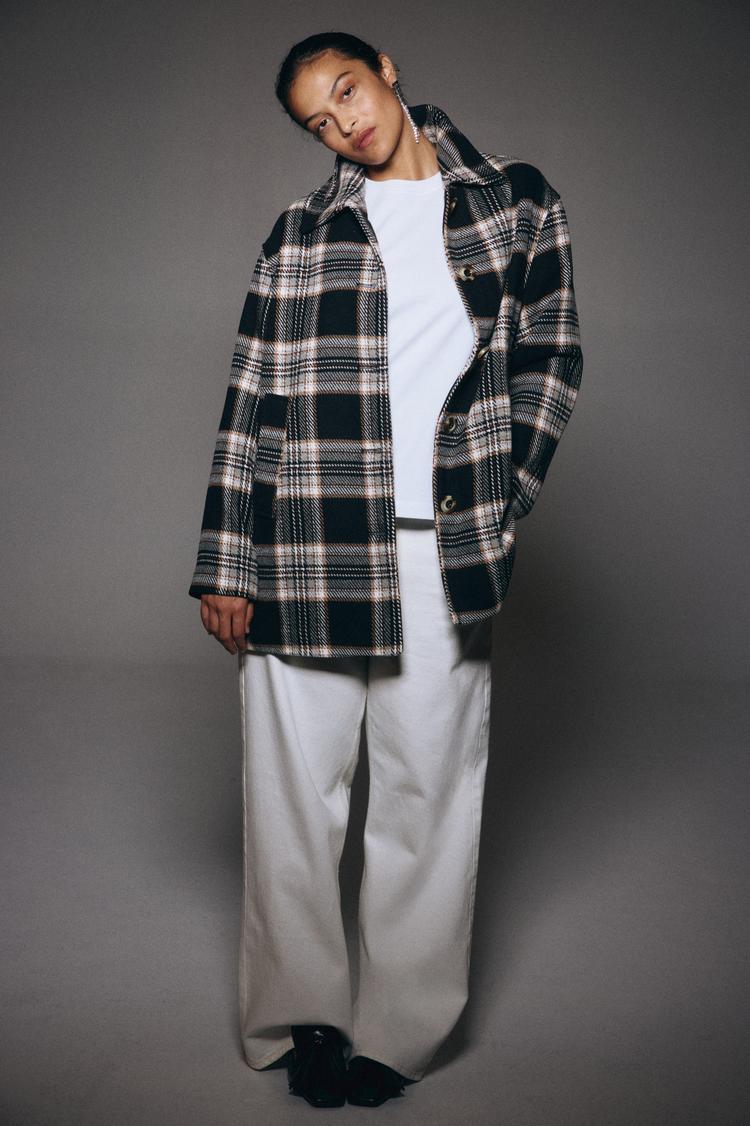This oversized hip-length coat features a classic turn-down collar and long drop-shoulder sleeves, offering a relaxed yet stylish fit. Crafted from a wool and polyester blend, it showcases a matte black base with an all-over white and beige plaid pattern, creating a timeless casual chic look. The front button closure and practical pockets add functional appeal. Perfect for autumn and winter streetwear, this coat pairs effortlessly with a variety of outfits for casual outings, travel, or everyday wear.