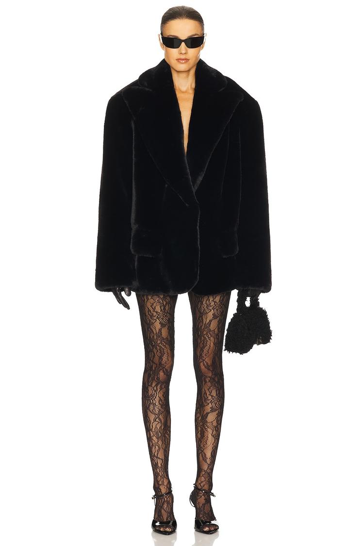This Oslo Faux Fur Coat features a luxurious black faux fur fabric with a hip-length, oversized silhouette for relaxed elegance. The single-breasted design is complemented by structured padded shoulders with epaulettes and classic lapels, creating a sophisticated neckline. Long regular sleeves and front flap pockets add functionality, while the hook and eye closure maintains a clean front. The coat is fully lined with a polyester-viscose blend for comfort and warmth, making it ideal for autumn and winter outings. Perfect for casual wear, business casual settings, and stylish night outs.