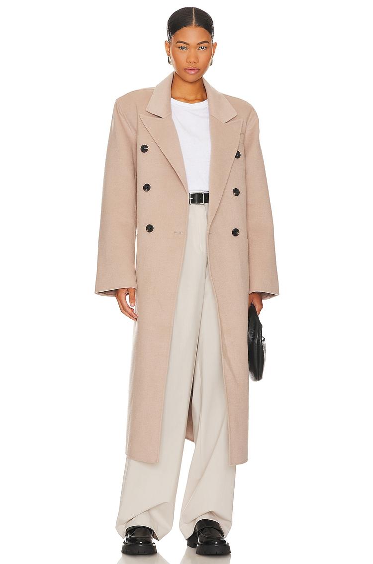 This elegant double-breasted overcoat in beige features a full-length silhouette with a regular fit, crafted from a wool-polyester blend for warmth and structure. It showcases a classic notch lapel collar and long regular sleeves, complemented by removable padded shoulders adding subtle volume and sophistication. The coat closes with front buttons and includes side slip pockets for functionality. Perfect for casual outings, workwear, and business casual settings during autumn, winter, and spring, this minimalist and refined piece embodies timeless style and practicality.