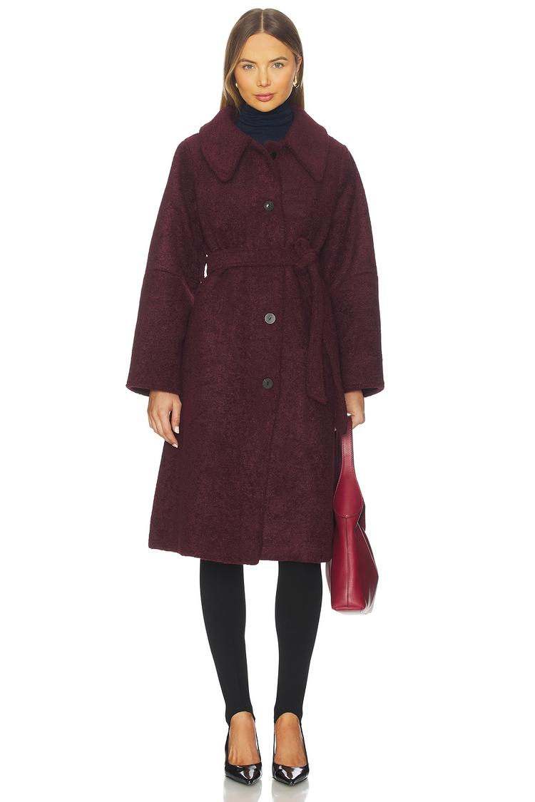This single-breasted Skylar Coat in matte dark burgundy offers a timeless and elegant silhouette with its turn-down collar and long regular sleeves. Crafted from heavyweight polyester with a bit of spandex for comfort, it features a calf-length cut with a detachable belt tie at the waist and front button closure. The coat includes side seam pockets for practicality and is fully lined with polyester and elastane for smooth layering. Perfect for autumn and winter, it suits casual outings, workwear, and travel with its regular fit and classic minimalist style.