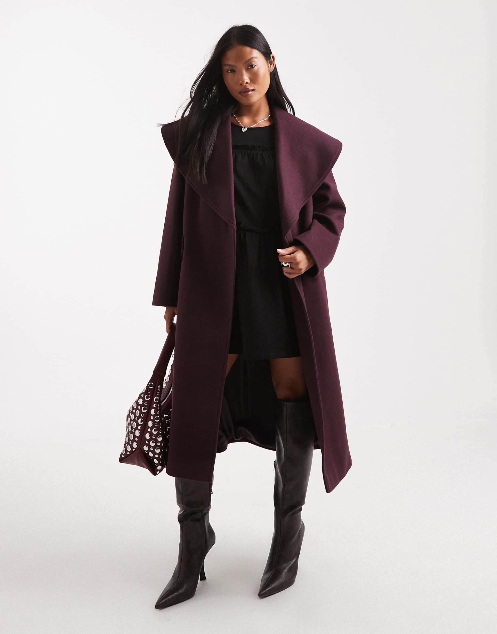 MISS SELFRIDGE PETITE FORMAL WRAP COAT IN PLUM