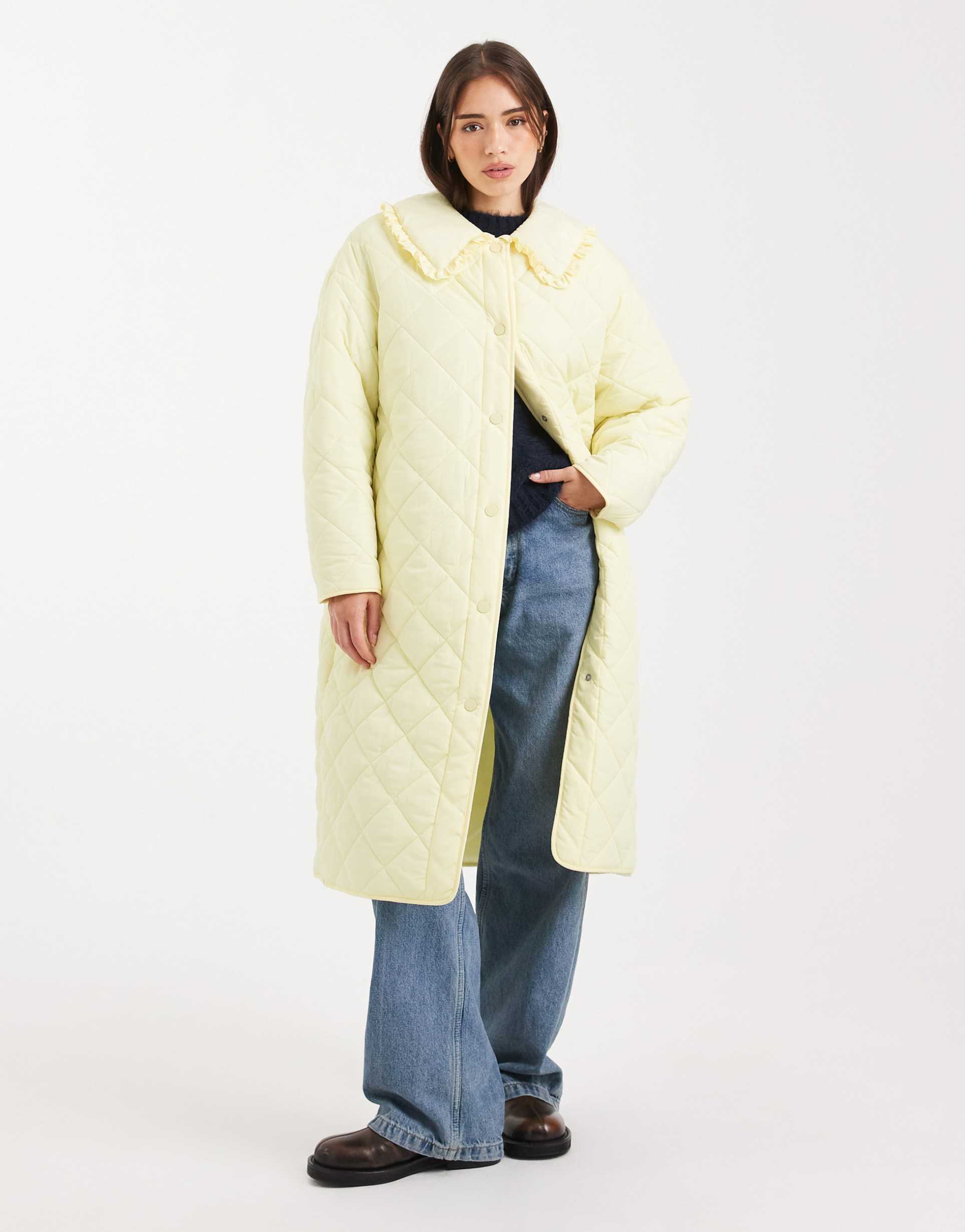 This Miss Selfridge quilted maxi coat in buttermilk features a relaxed fit and full length silhouette that offers cozy coverage for colder seasons. The smooth woven polyester fabric is quilted for texture and warmth, complemented by a spread collar with delicate ruffled trim adding a feminine touch. Long sleeves and a snap button placket provide classic utility, while two side slip pockets enhance functionality. Lined with polyester, this coat suits casual outings, travel, and stylish workwear during autumn and winter months.