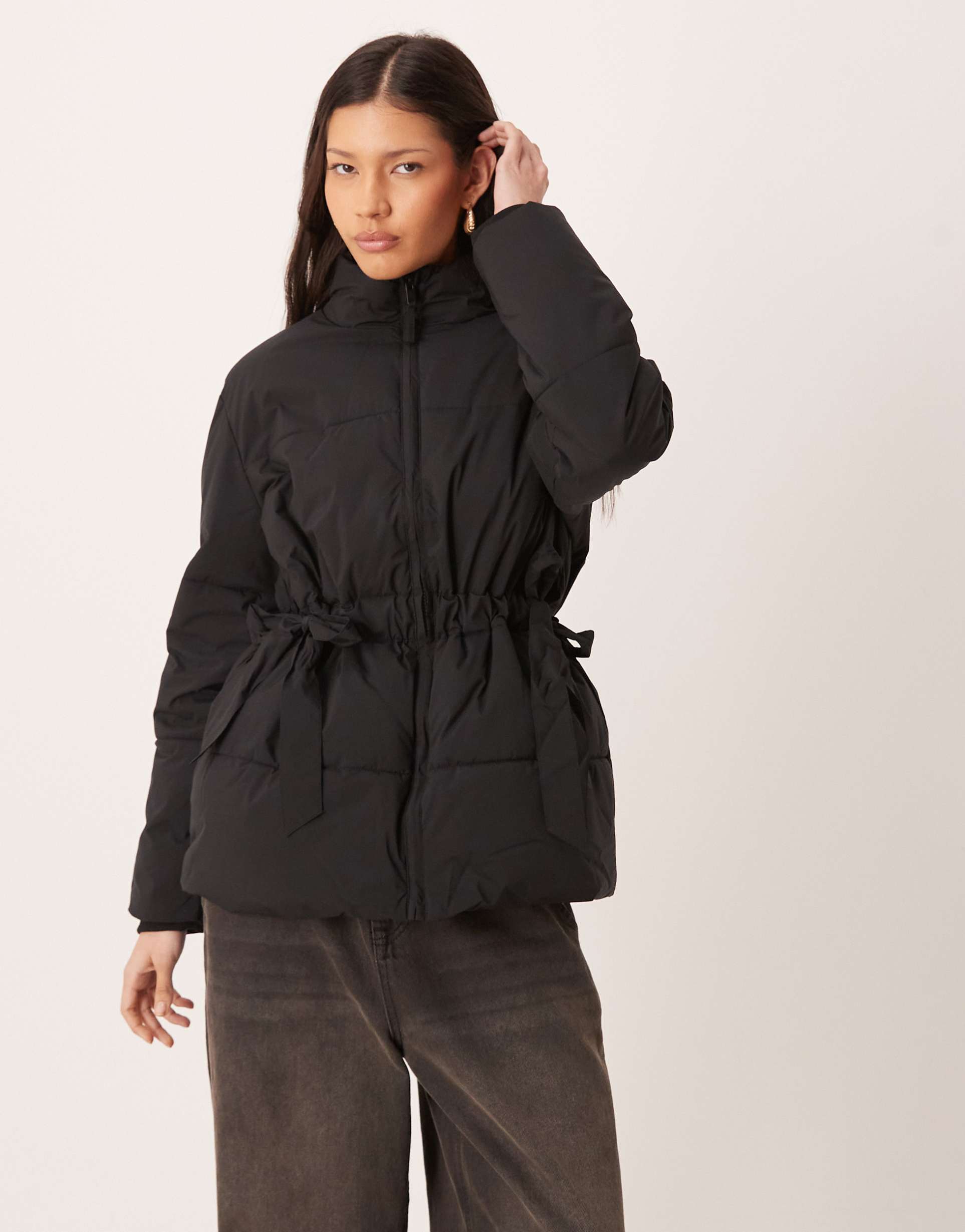 This black puffer-quilted coat features a hip-length silhouette with a regular fit, perfect for autumn and winter wear. Crafted from smooth woven polyester, it showcases a funnel neck and long regular sleeves for added warmth. Functional front zipper closure and side pockets provide practicality, while the tie details at the sides add a subtle belt-like design detail that enhances the waist. Ideal for casual outings, travel, and workwear, this coat combines minimalist style with cozy insulation to keep you comfortably stylish through colder seasons.